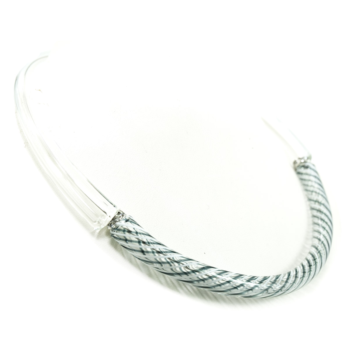 Elegante collana di design in vetro soffiato e filigranato. Opera leggera grazie alla tecnica di lavorazione in vetro soffiato.