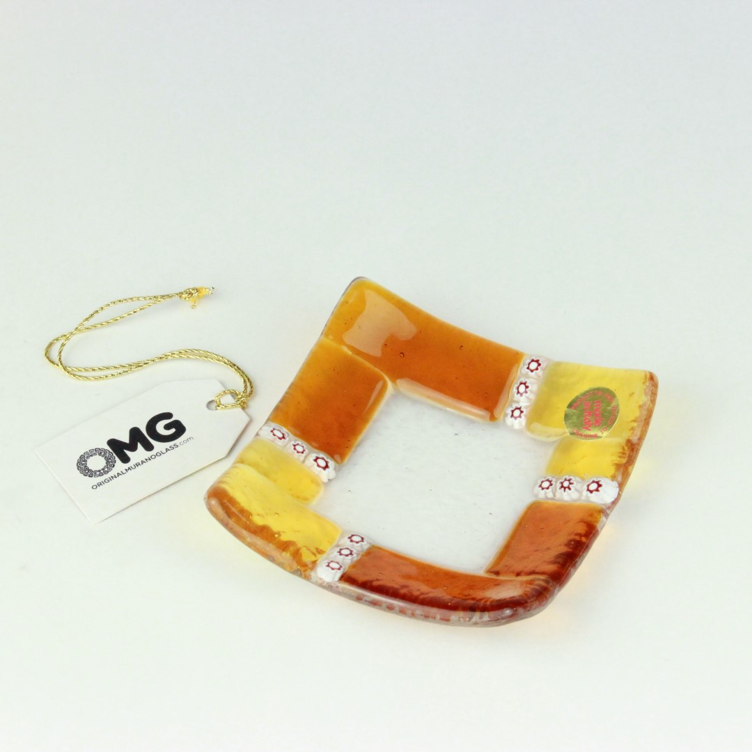 Piatto di forma quadrata in vetro con pregevole decoro in murrina. Realizzato con la tecnica della vetro fusione.