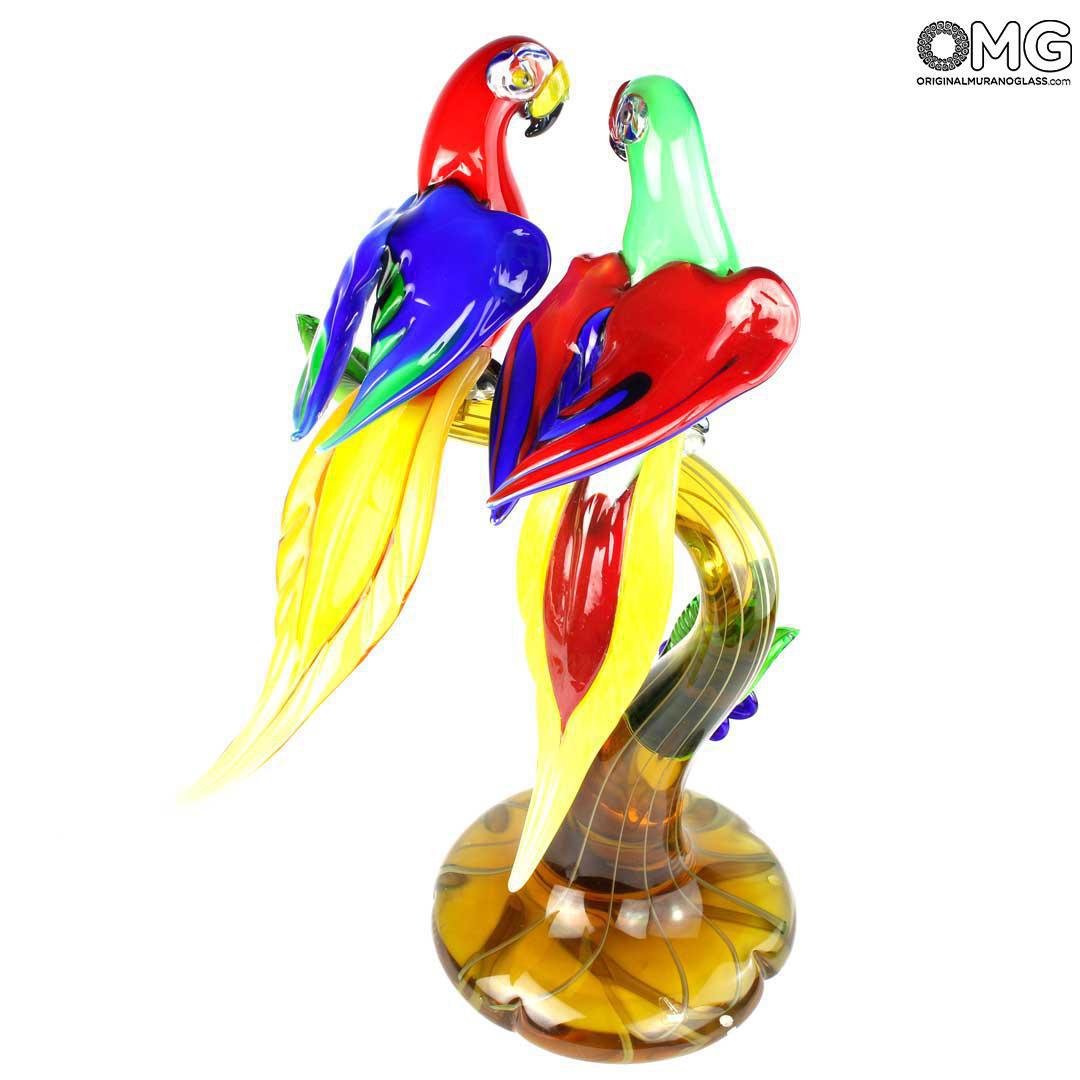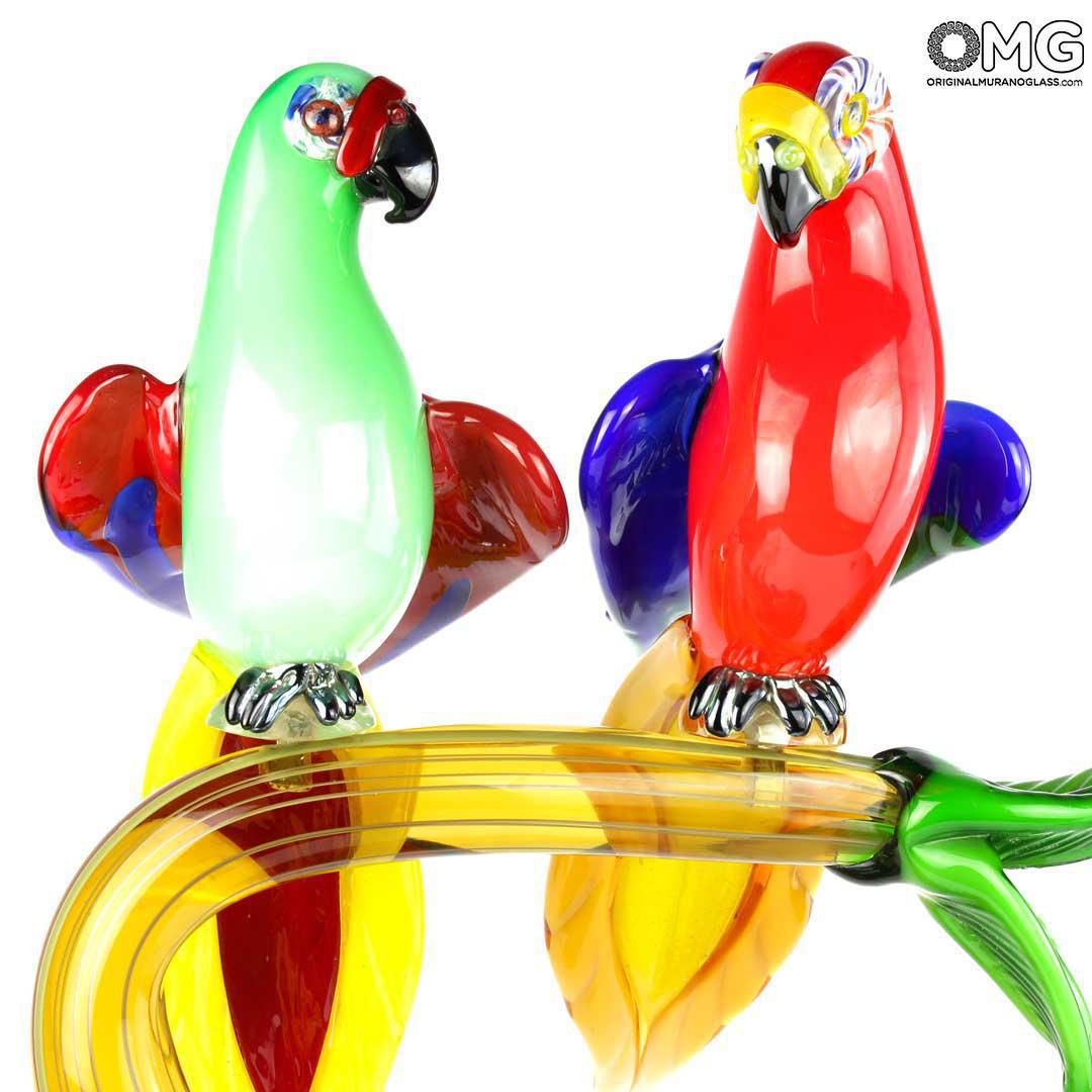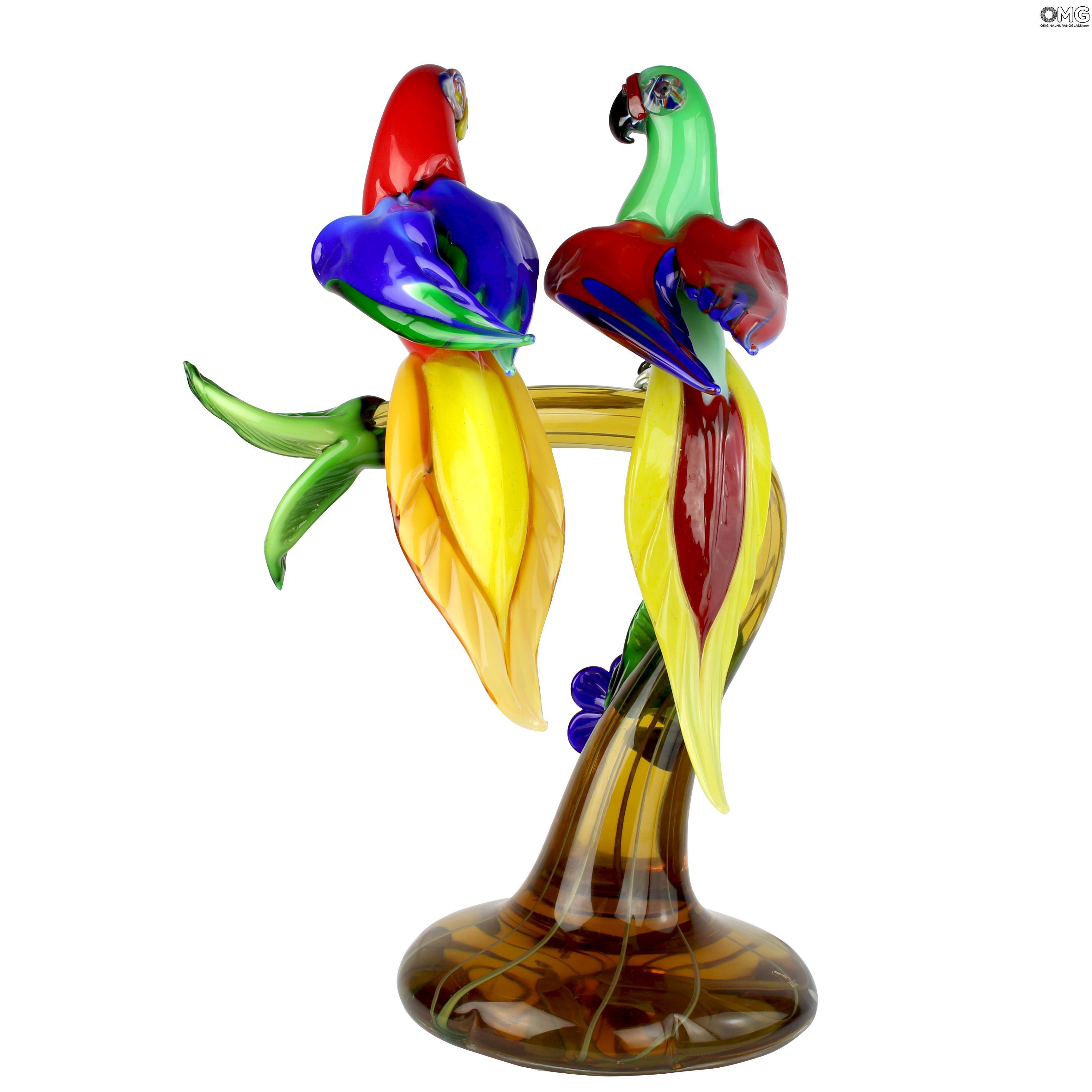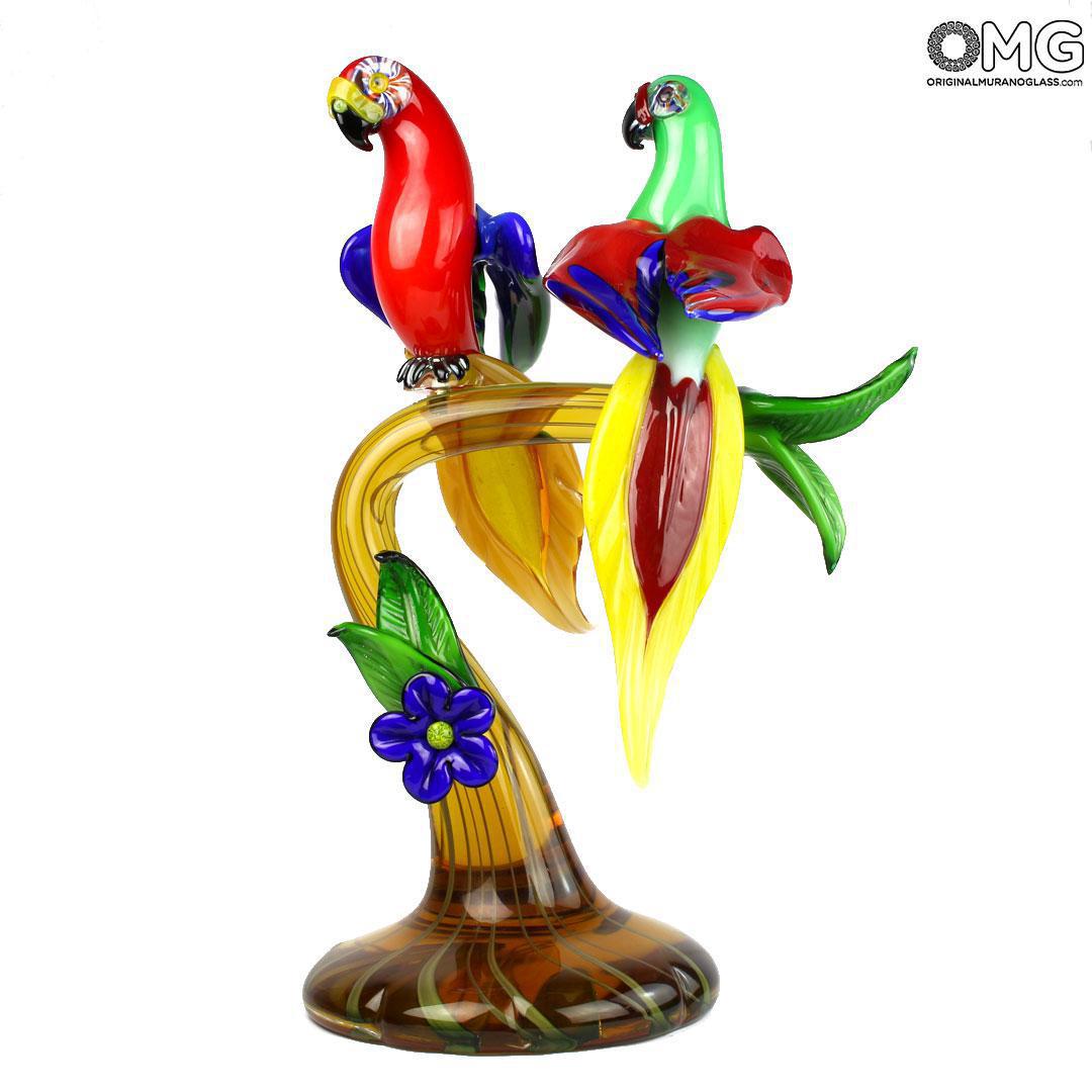 Coppia di Pappagalli su Ramo - Modellato a Mano - Vetro di Murano Originale OMG