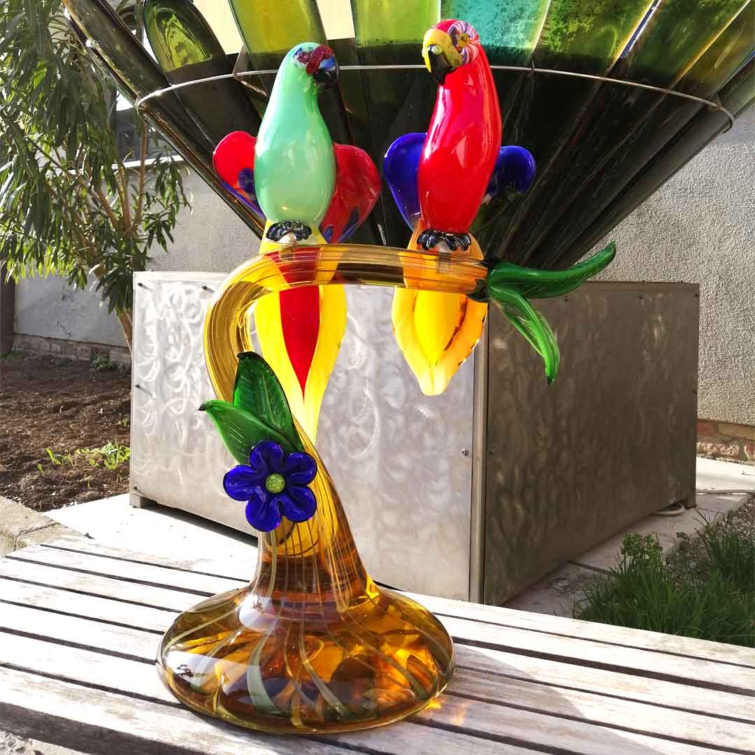 Sinuosa scultura di pappagalli femmina e maschio in vetro variopinto, lavorato a mano libera a puntello con le tecniche di lavorazione del vetro a Murano. Questa bella scultura, estremamente elegante, è l'opera d'arte perfetta per un ripiano di lusso o per completare il ricco mobilio della tua casa. Puoi metterla sotto la luce di una lampada, sul tavolo o in prossimità di una pianta. Ovunque la poni, questa elegante scultura ti regalerà tutto il suo fascino.
