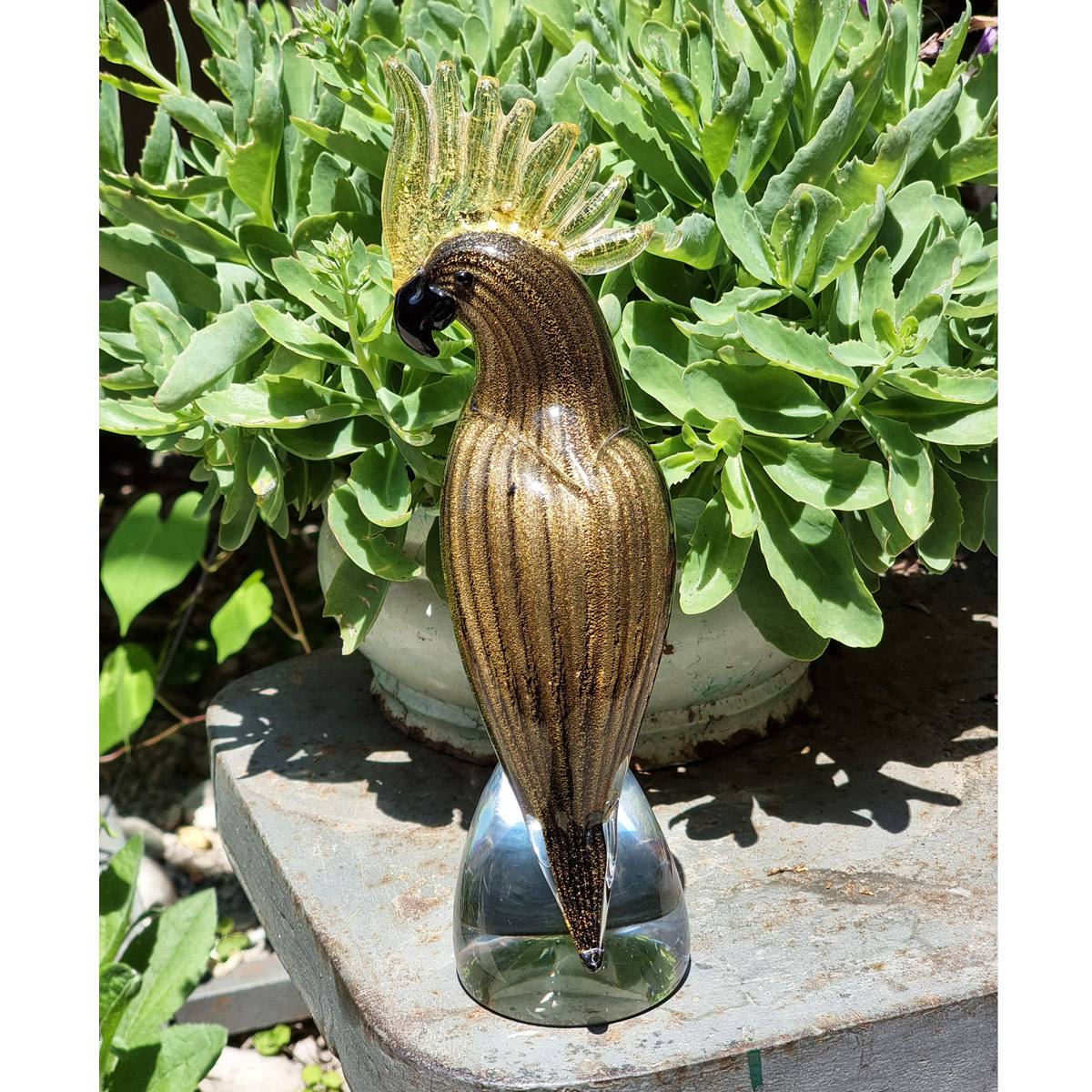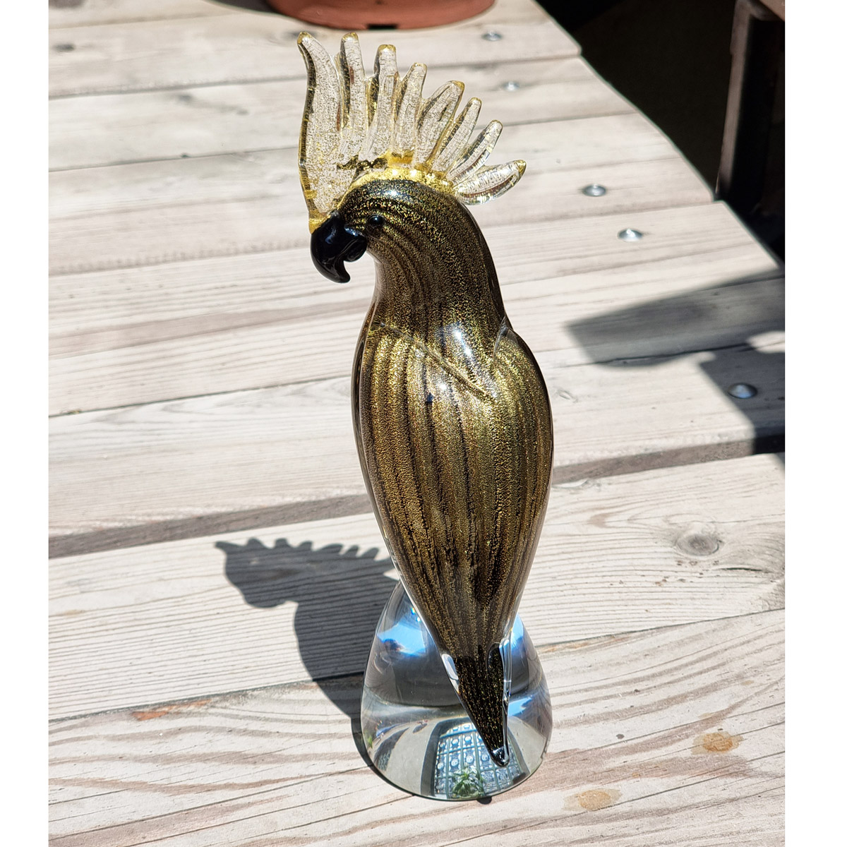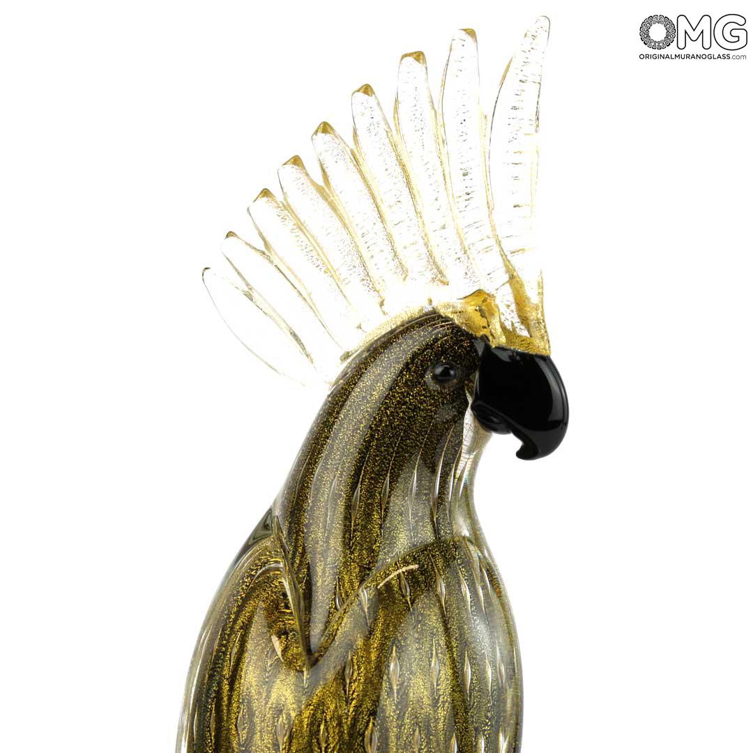Questa scultura in vetro di Murano raffigurante un pappagallo è realizzata a mano e impreziosita con il colore nero e foglia d'oro su base di cristallo. Il pappagallo è estremamente elegante e lussuoso, perfetto per essere posizionato su una mensola o un tavolo e arricchire il vostro arredamento.