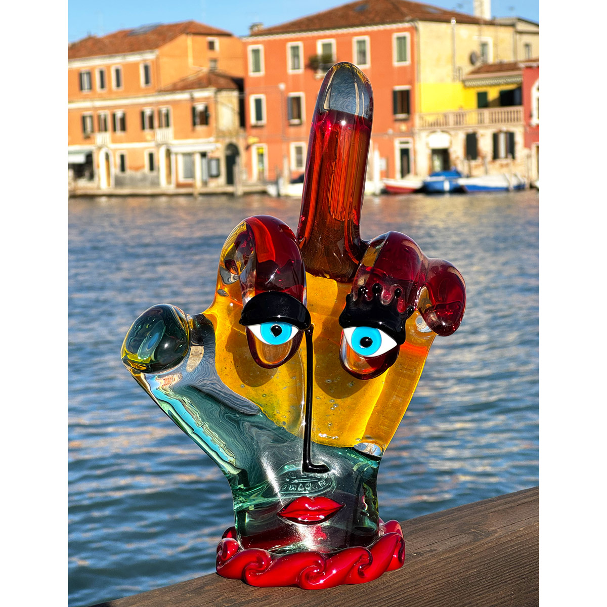 L'arte del vetro di Murano ottiene un inaspettato tocco contemporaneo in questa scultura unica della mano di Picasso. In un omaggio all'artista più famoso e rivoluzionario del XX secolo, Pablo Picasso, gli inventivi maestri di Murano hanno creato questa scultura in vetro di Murano, che riflette lo stile astratto e l'approccio d'avanguardia di Picasso all'arte. La mano ispirata a Picasso rappresenta il movimento surrealista nell'arte, con colori vivaci e tratti del viso. I ricchi colori profondi del rosso, giallo, arancione e blu e gli occhi azzurri curiosi trasmettono uno stato d'animo solare e un'atmosfera di liberazione dai canoni dell'arte e della tradizione.