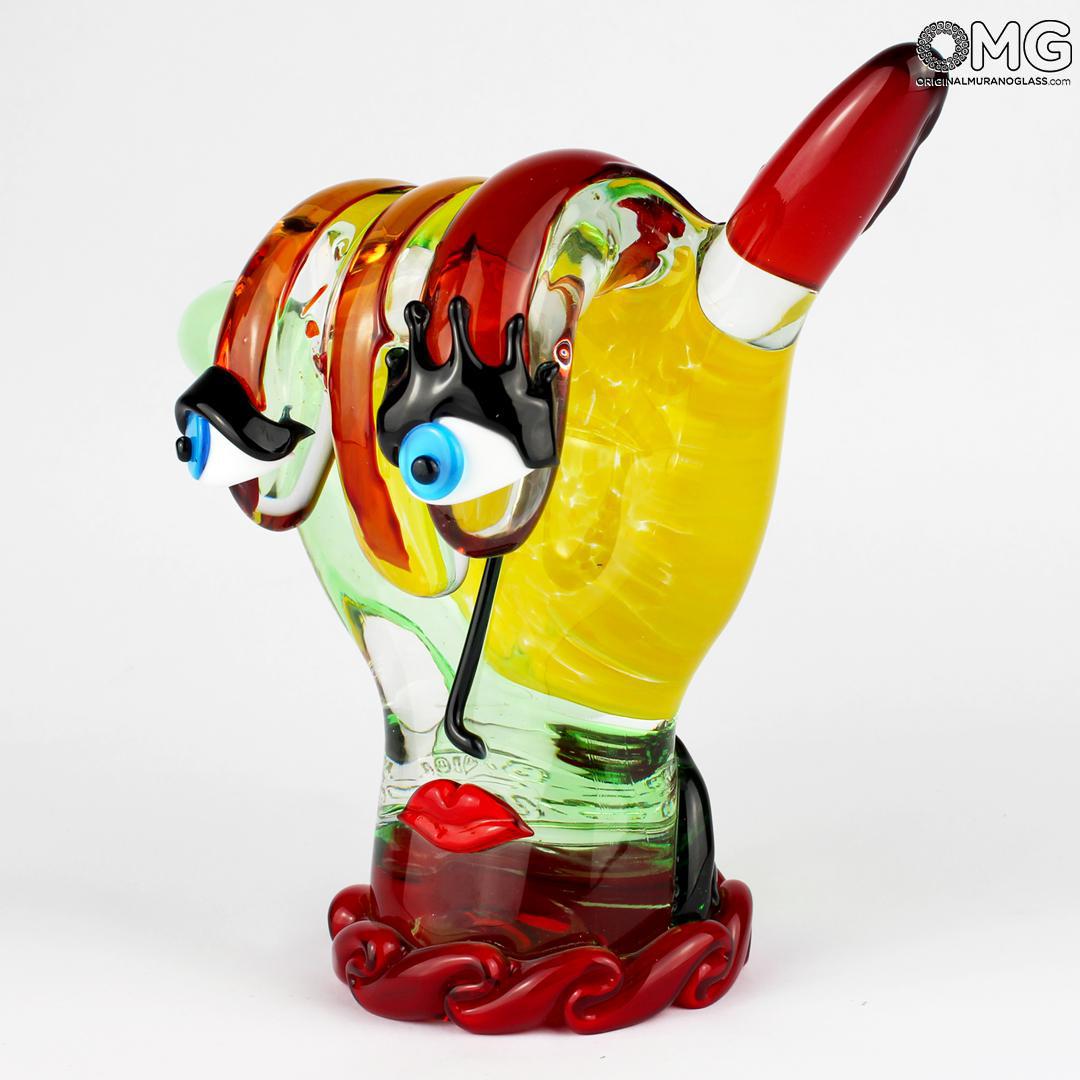 L'arte del vetro di Murano ottiene un inaspettato tocco contemporaneo in questa scultura unica della mano di Picasso. In un omaggio all'artista più famoso e rivoluzionario del XX secolo, Pablo Picasso, gli inventivi maestri di Murano hanno creato questa scultura in vetro di Murano, che riflette lo stile astratto e l'approccio d'avanguardia di Picasso all'arte. La mano ispirata a Picasso rappresenta il movimento surrealista nell'arte, con colori vivaci e tratti del viso. I ricchi colori profondi del rosso, giallo, arancione e blu e gli occhi azzurri curiosi trasmettono uno stato d'animo solare e un'atmosfera di liberazione dai canoni dell'arte e della tradizione.