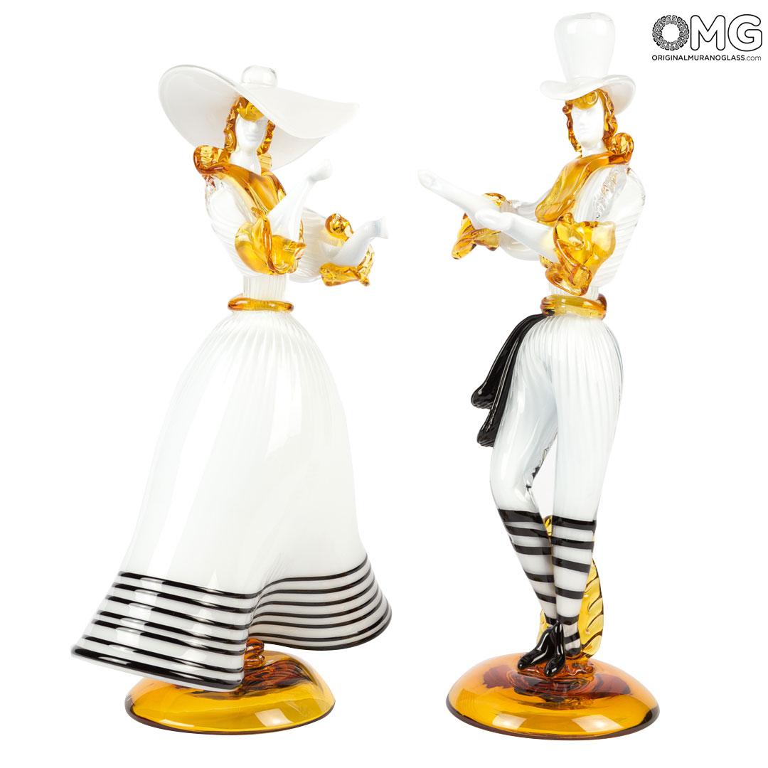 Bellissima coppia di danzatori, dama e cavaliere in vetro bianco con particolari in ambra e nero. Lavorate interamente a mano con la tecnica della modellazione a caldo. Molto curate nei particolare e ricche di stile veneziano. Oltre ad essere una riproduzione incredibilmente fedele ai modelli reali, questa coppia riccha di fascino, donerà un tocco di raffinatezza al tuo salotto.