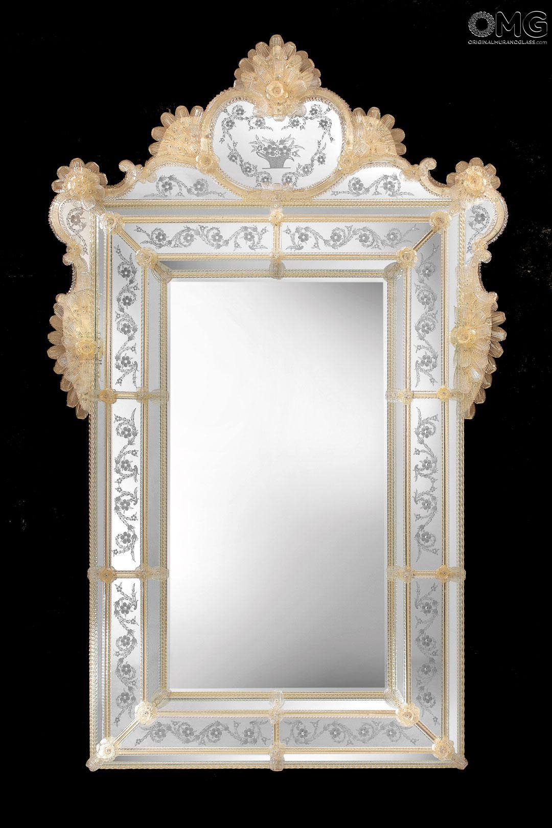 L'opera d'arte è disegnata e realizzata con cura nei dettagli dai nostri artigiani specchieri, dai maestri vetrai per gli abbellimenti in vetro di Murano, e falegnami.