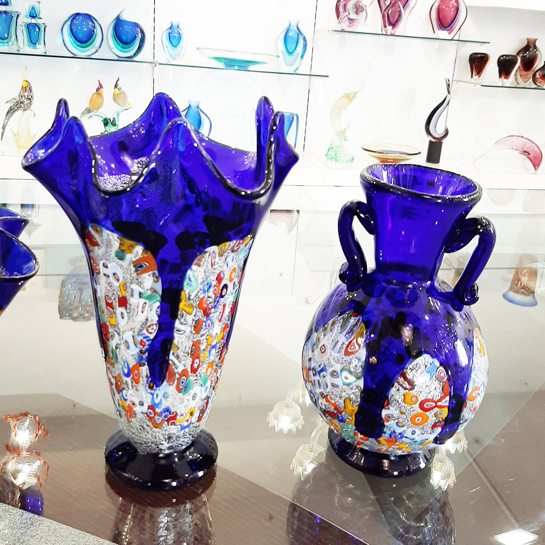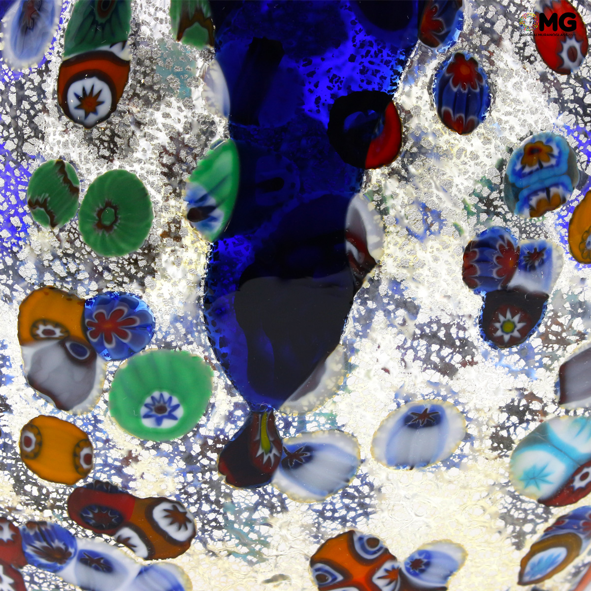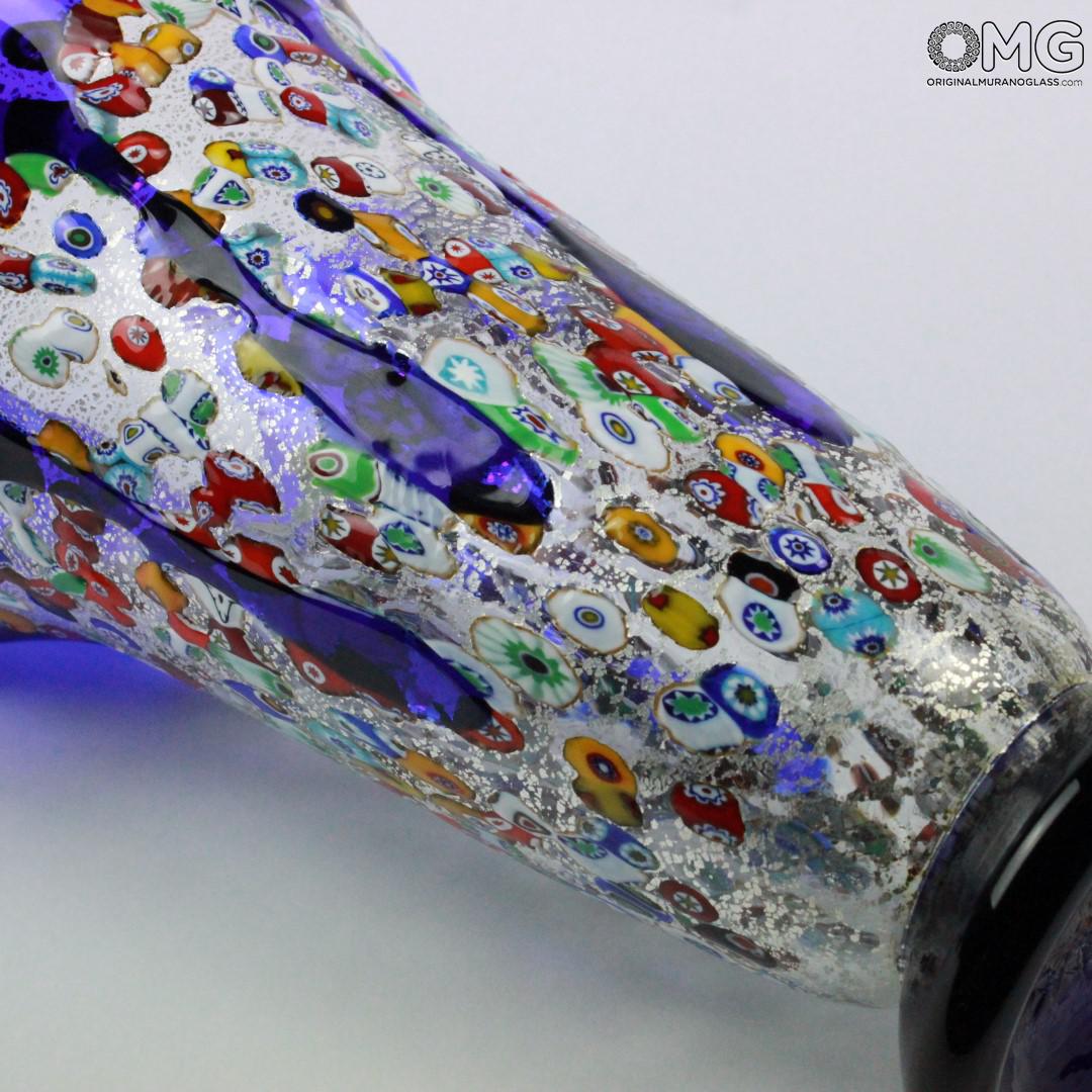 Vaso realizzato con la tecnica del vetro soffiato decorato con foglia d'argento e coloratissime murrine variegate.
