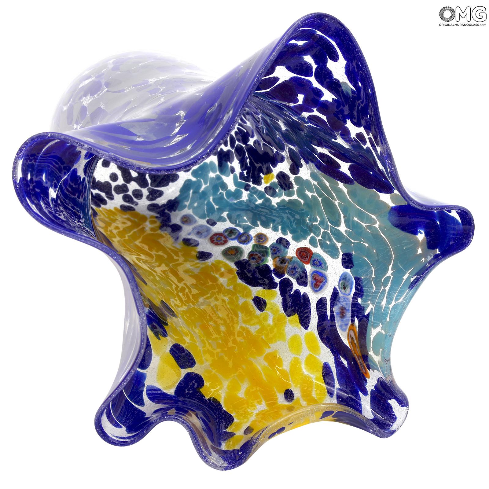 Centrotavola in vetro di Murano originale soffiato e decorato con millefiori murrine multicolore e frammenti di vetro colorato. Il vaso è firmato dal maestro vetraio con incisione a freddo.