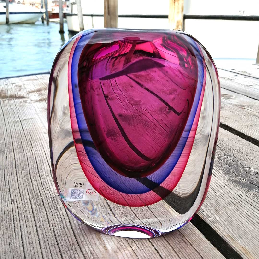 Vaso realizzato a mano di nobile fattura. Per realizzarlo una prima massa di viola pallido viene coperta da una di blu, quindi di nuovo sommersa da una di viola e da una di cristallo. Dopo esser soffiato il vaso riceve gli ultimi ritocchi e l'opera d'arte risulta pronta. Un vaso variopinto ma allo stesso tempo sobrio ed elegante. Adatto ad abbellire un'ampia varietà di mobilio.