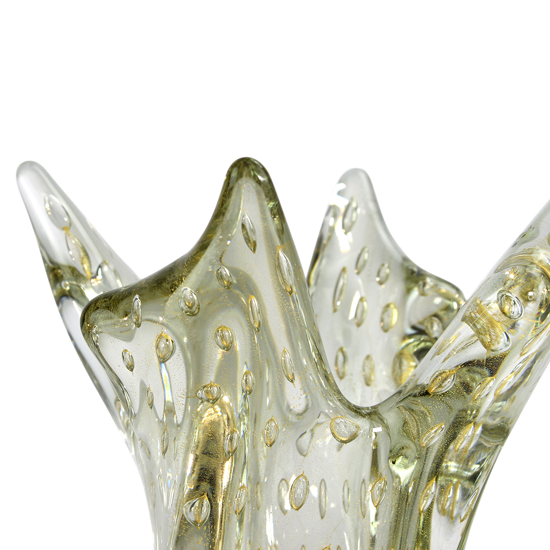 La ciotola di vetro piegata ha un design floreale con un vivace colore grigio. L'incredibile schema controllato delle bolle è stato ottenuto con la tecnica del bullicante con foglia d'oro 24K.