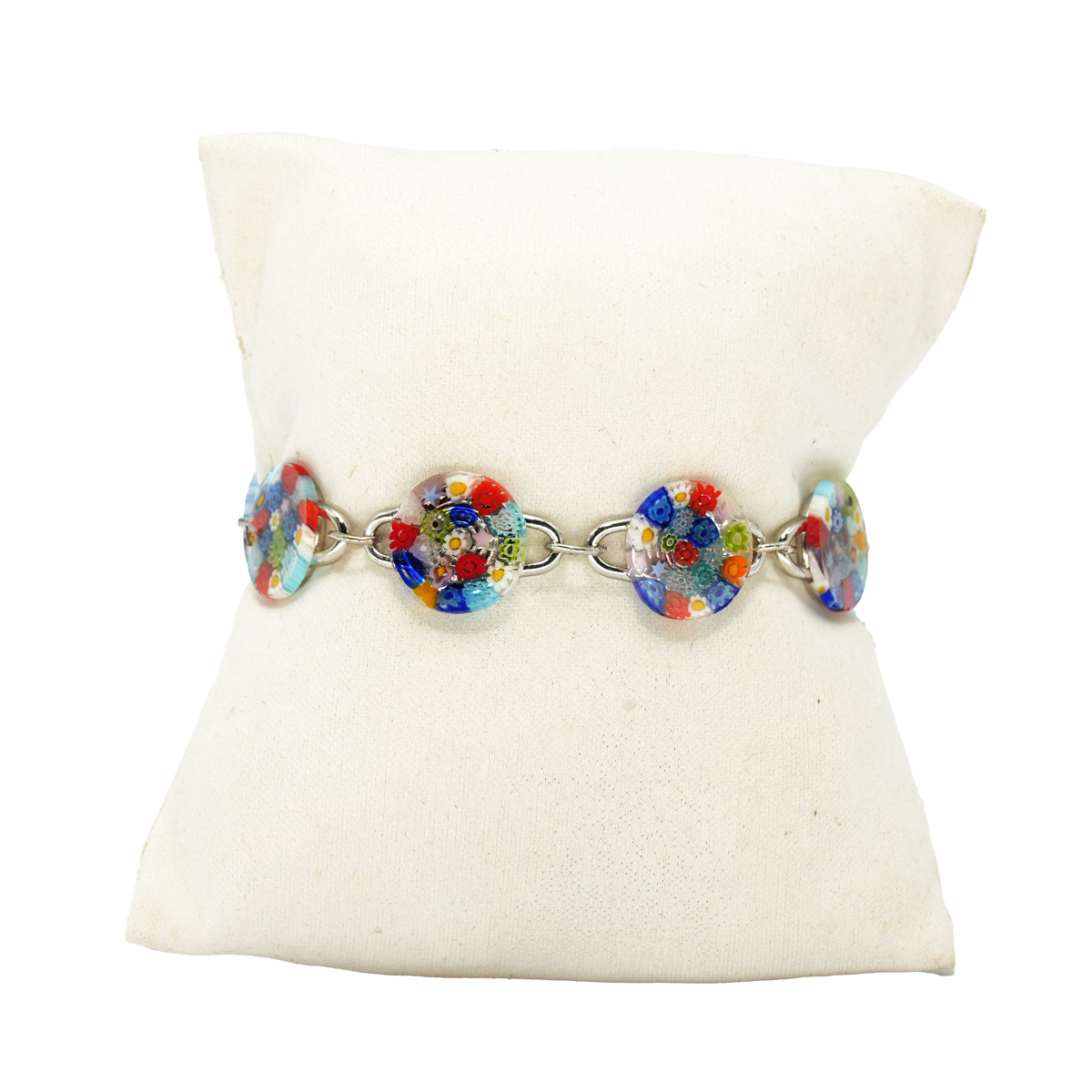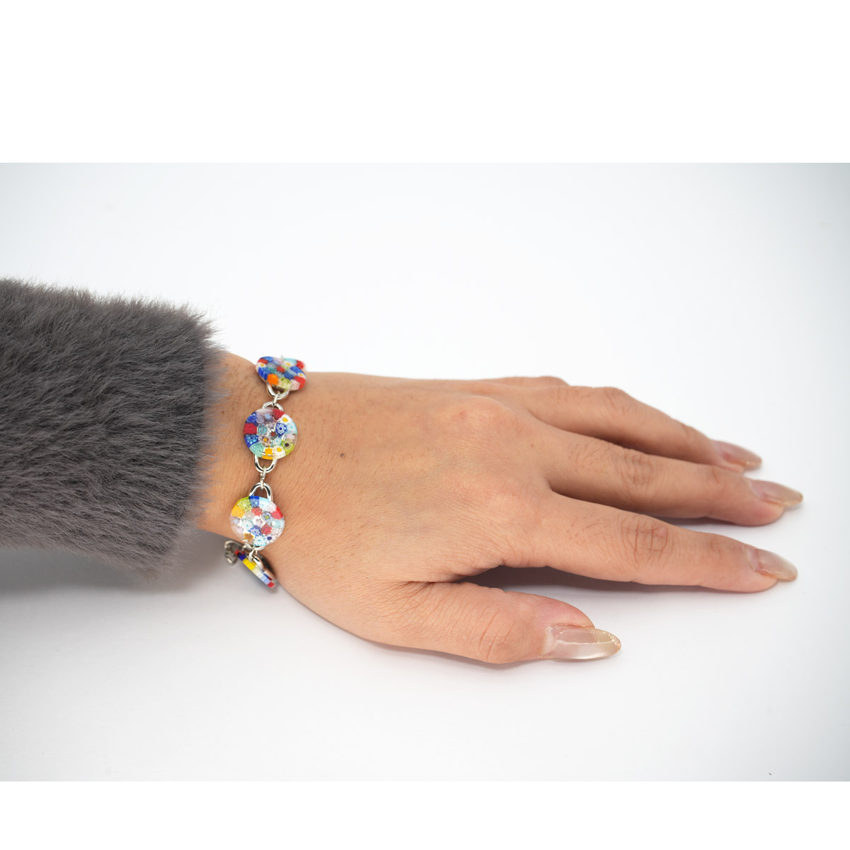 Unique and elegant, this Venetian bracelet is hand-made using the most famous Murano glass technique, Millefiori Murrina (a thousand flowers) - which has become a trademark of Murano glass making. This easily-recognizable Murano glass accessory features a symmetric eye-catching pattern of colorful stylized flowers in rich hues, which will add a touch of authentic Venetian style to any outfit. This bracelet is made in lamp working technique, and each piece is worked as single .