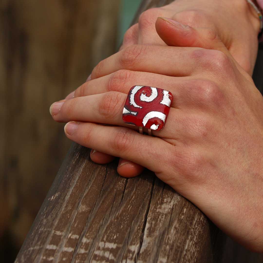 Glass ring made with hot modeling technique and engraved silver leaf. Handmade in Murano glass.