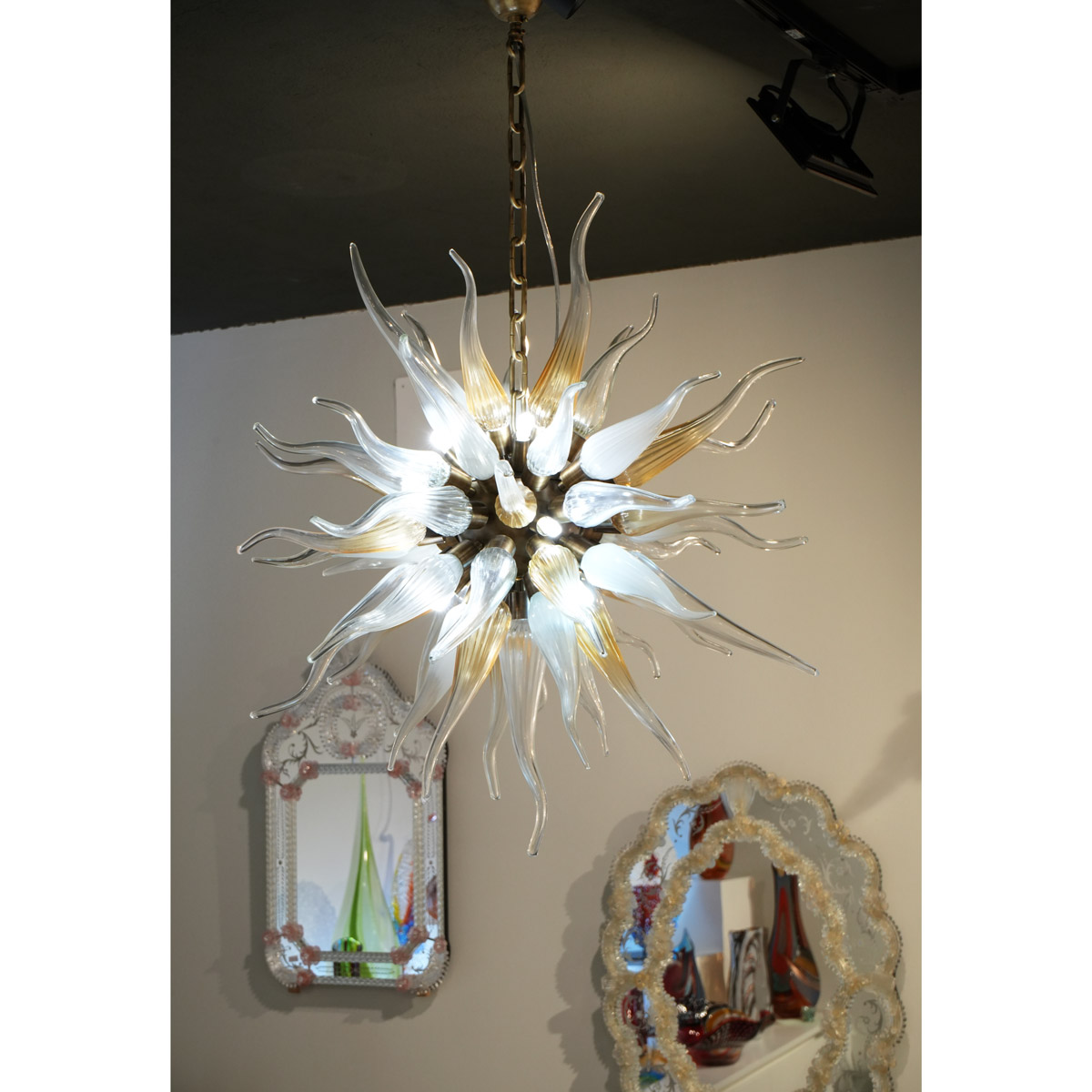 Beautiful original Murano glass lamp made by assembling the blown pipes one by one on a central chromed structure.