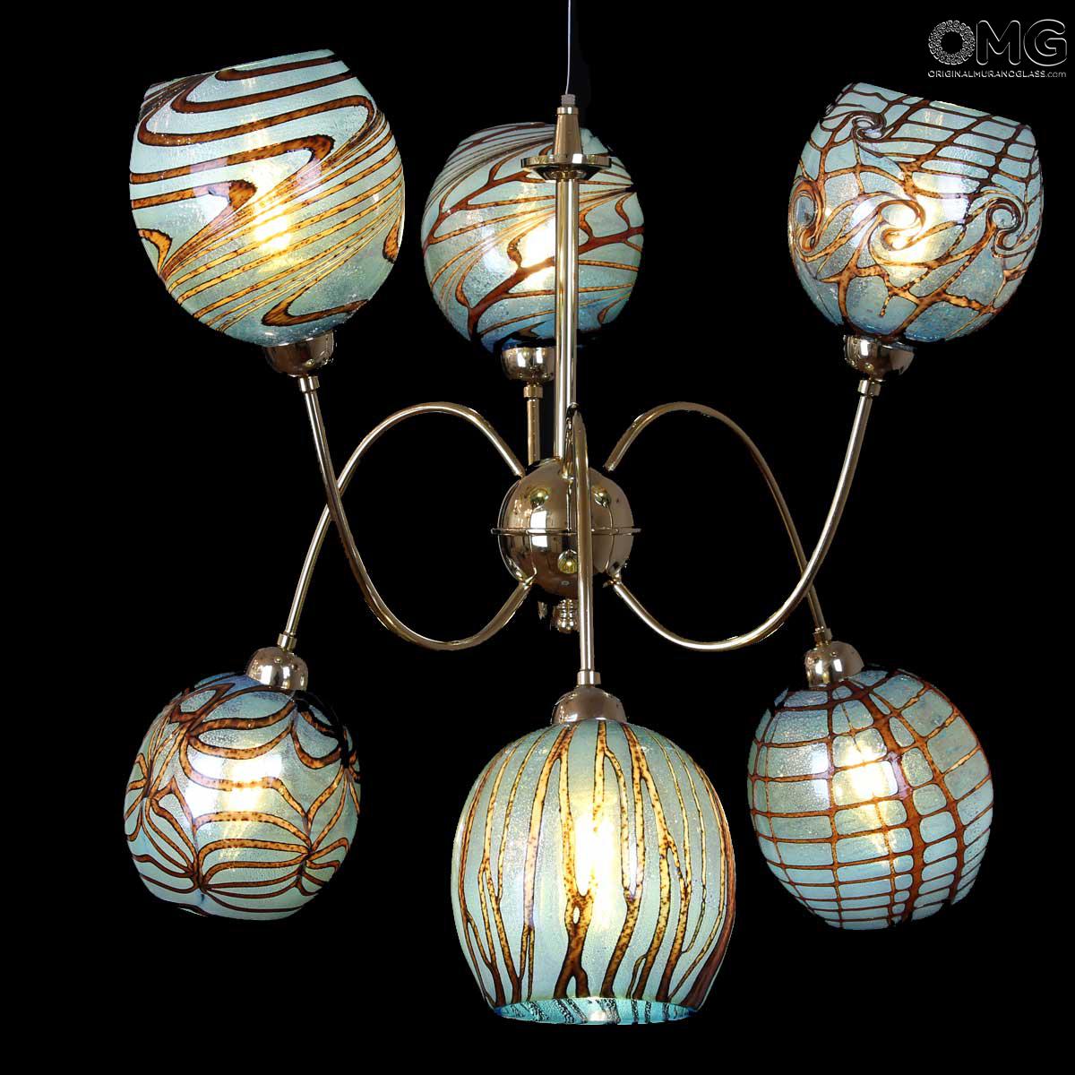 Original Murano Glass hanging lamp handmade in original venetian glass, with 6 cups holder in artistic glass. The cup is very elegant. This Murano glass light will enrich your living room bed room and any room space with unique light colors.