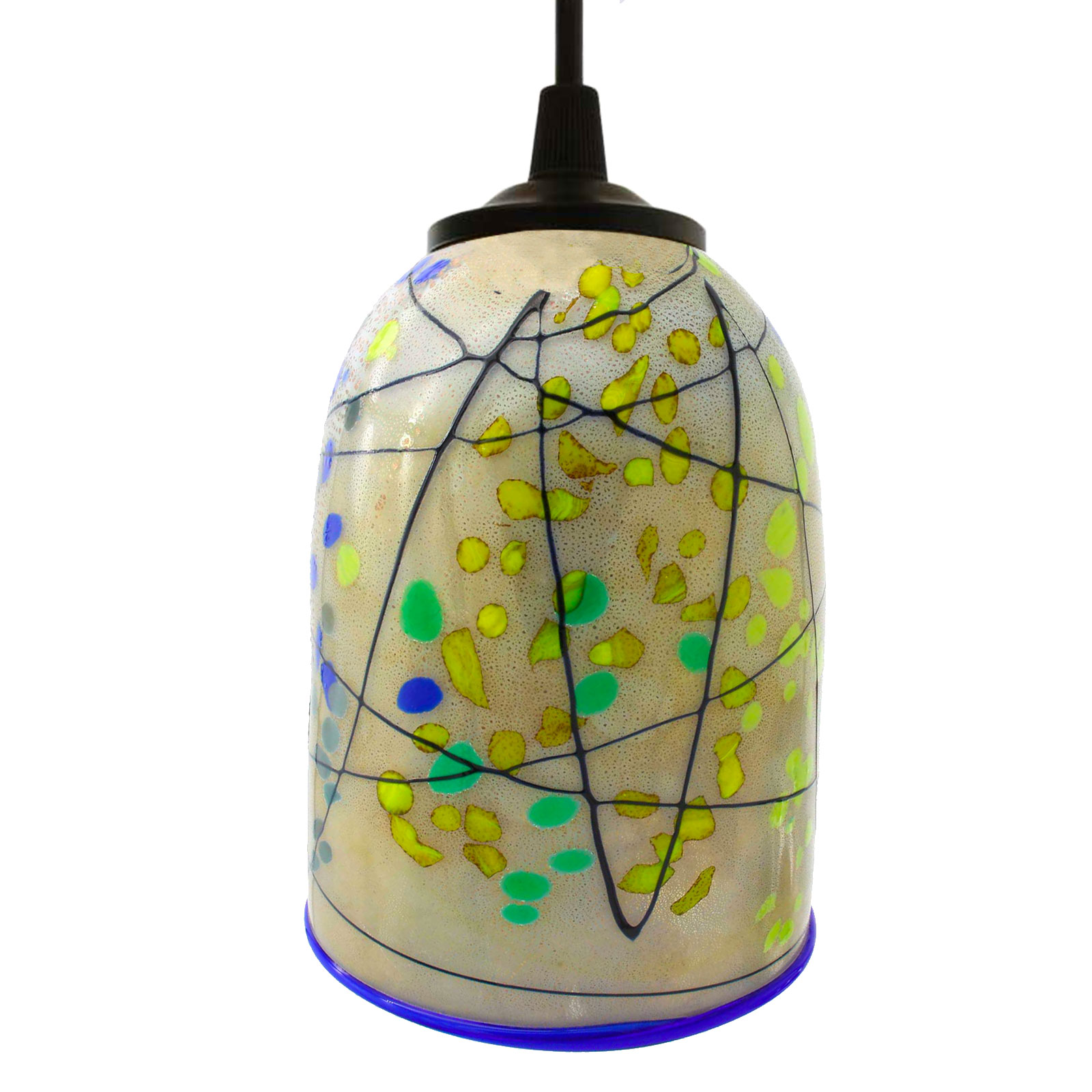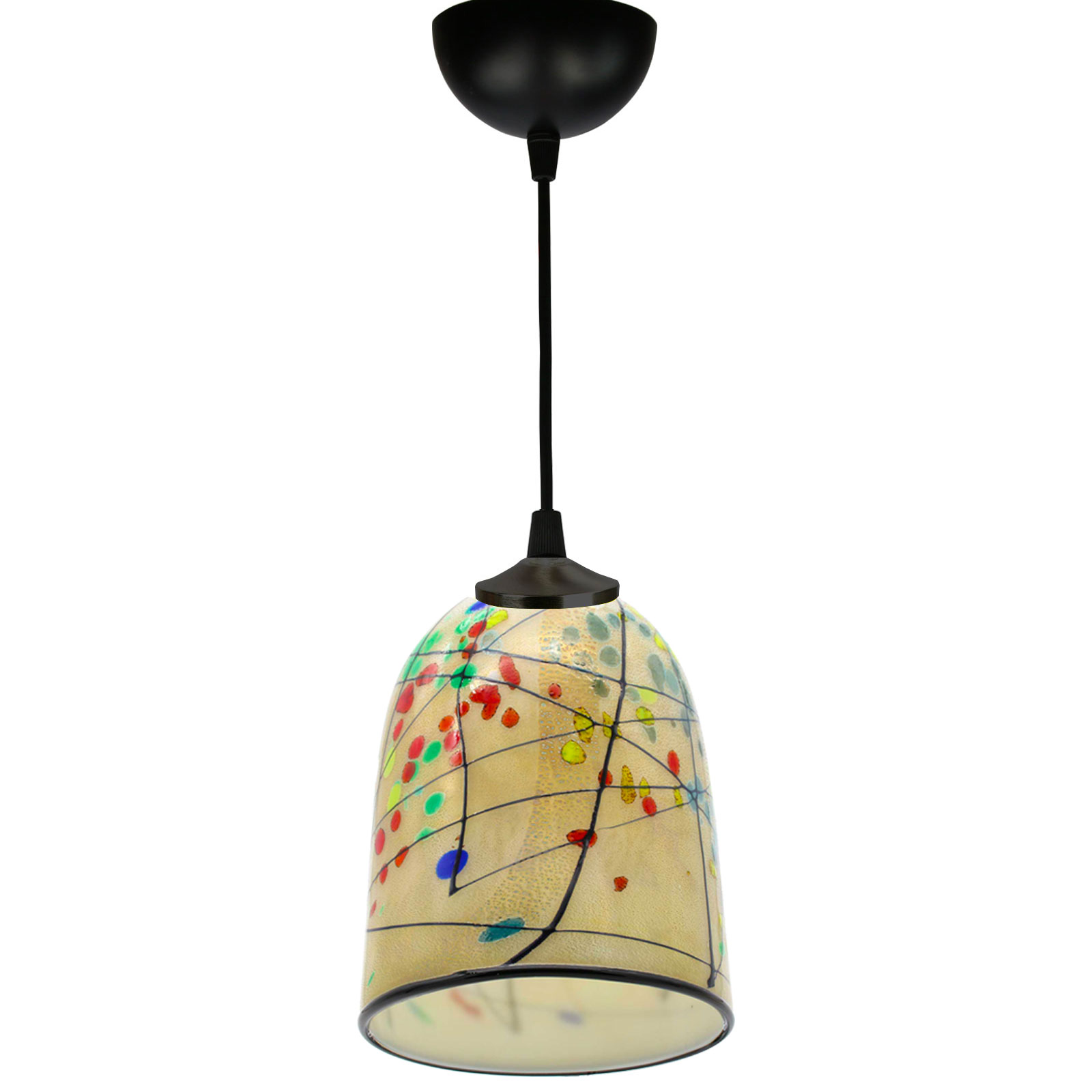 Murano glass hanging lamp handmade in original venetian glass, 1 light, with cup holder in artistic glass with millefiori murrine, canes and silver. The cup is very elegant and colorful. this Murano glass light will enrich your home, kitchen, living room, bed room and any interior space with unique light colors.