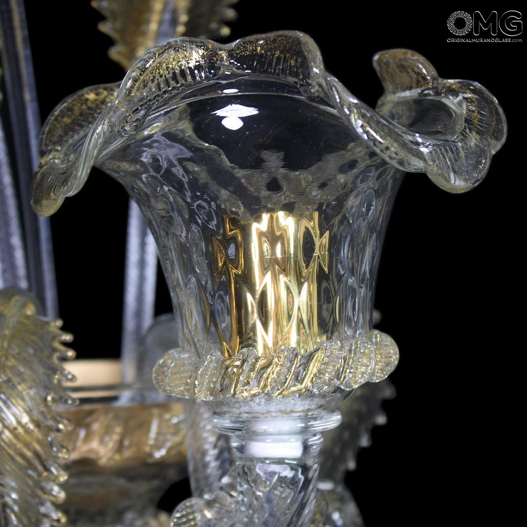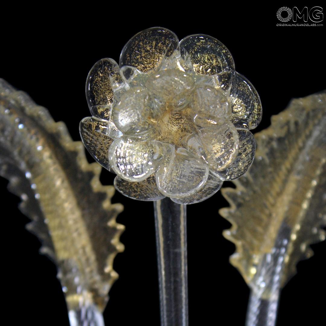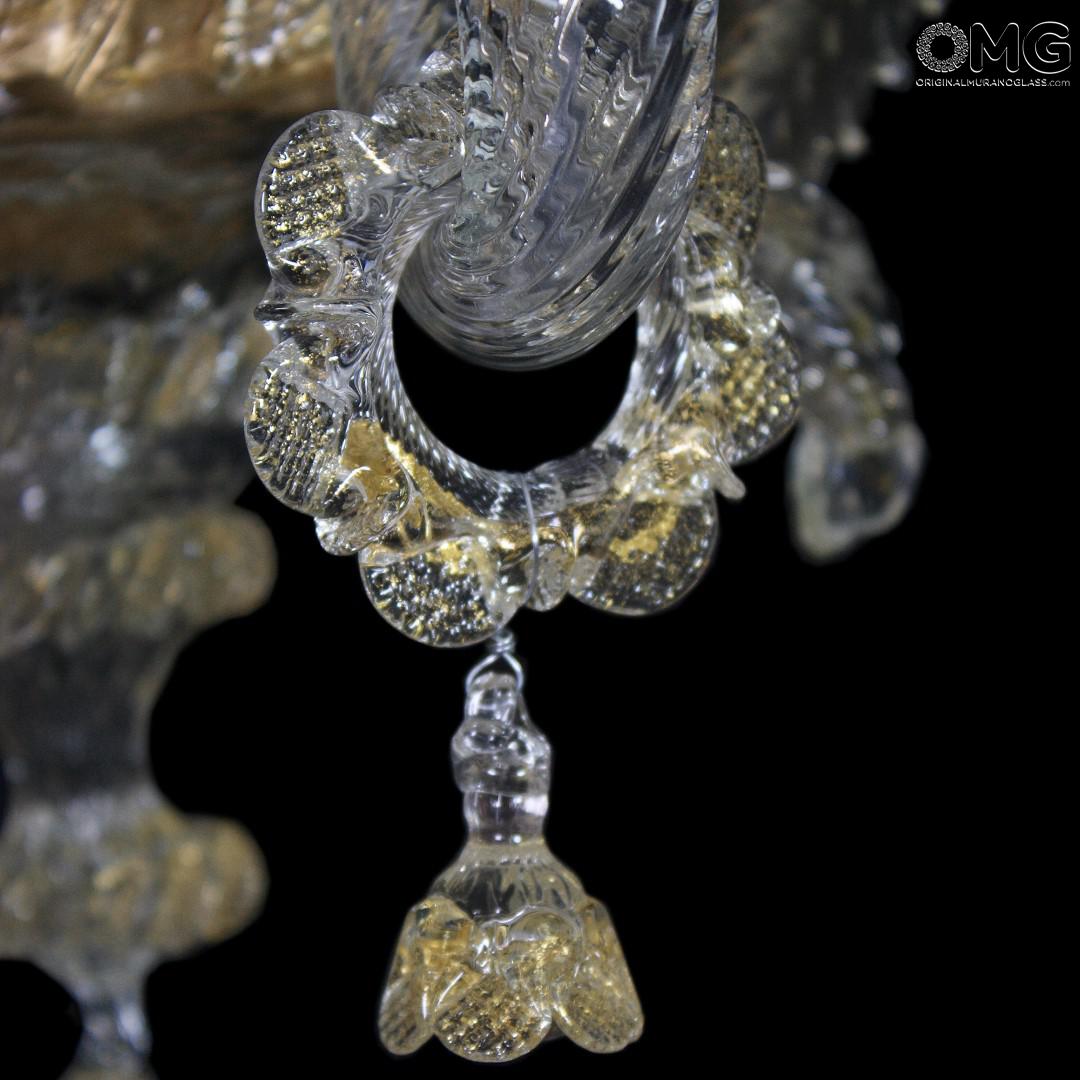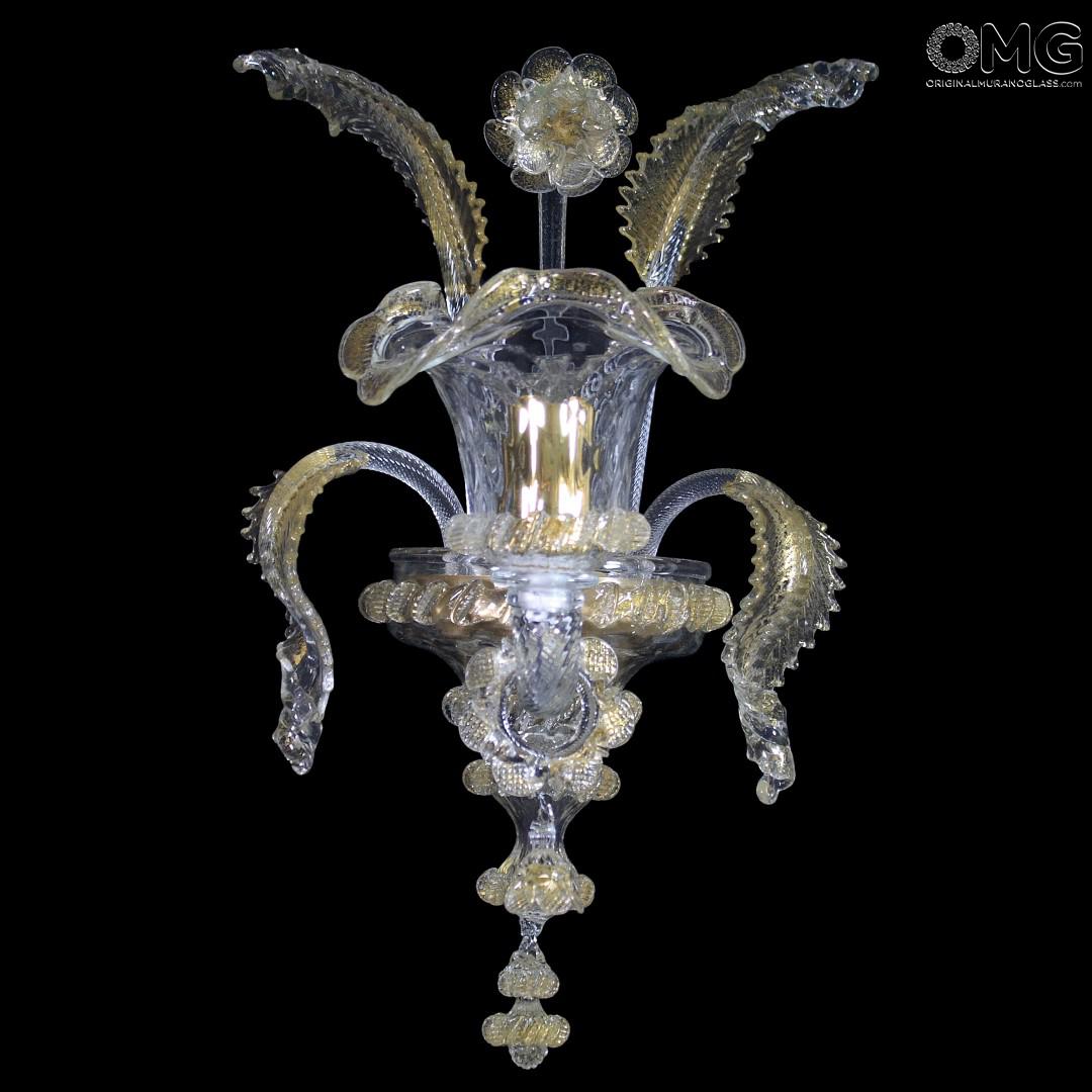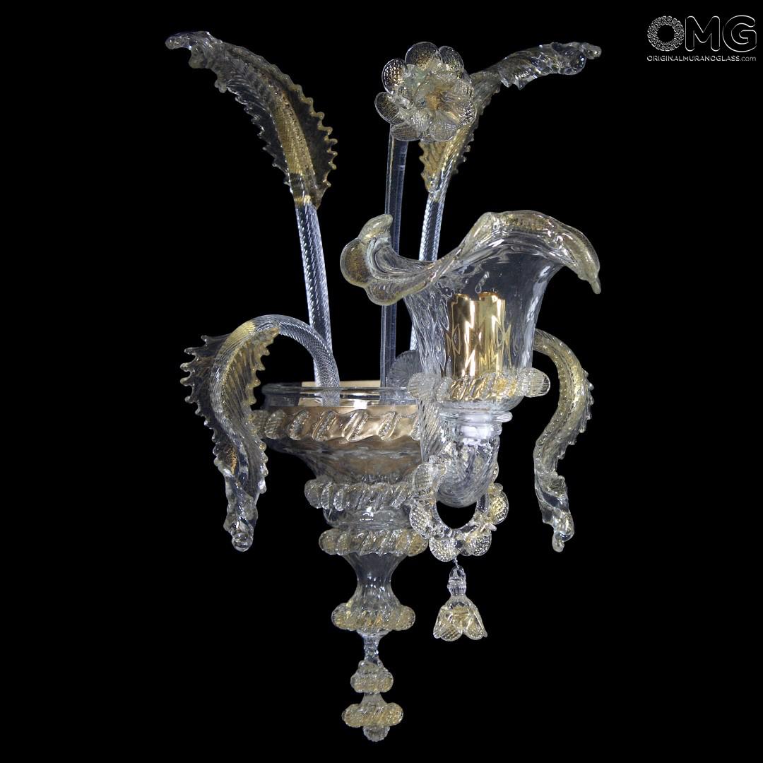One light wall lamp in clear glass and gold 24kt details. It is handmade according to the old Murano glass tradition, handcrafted in blown glass.