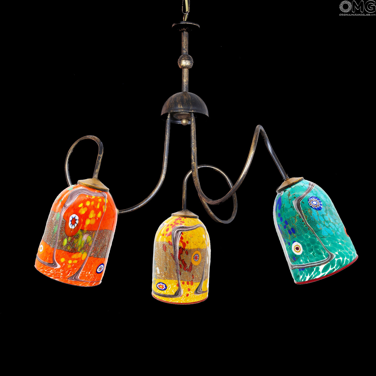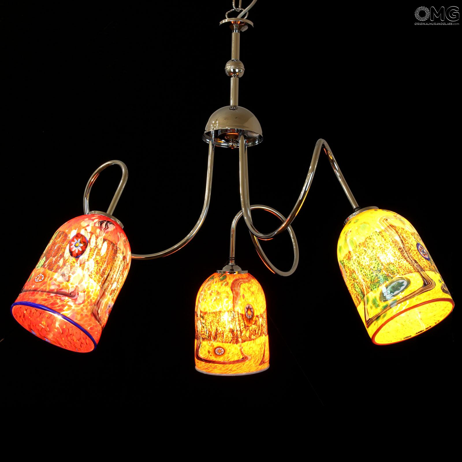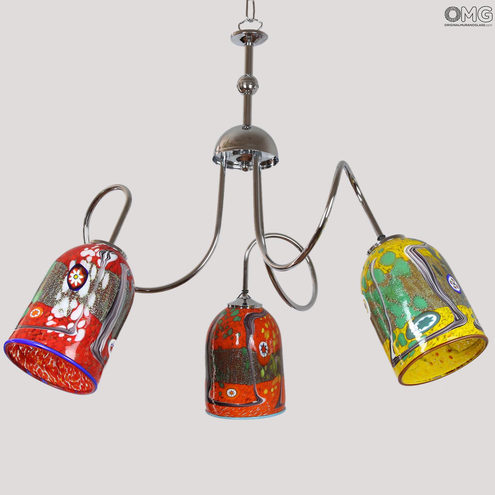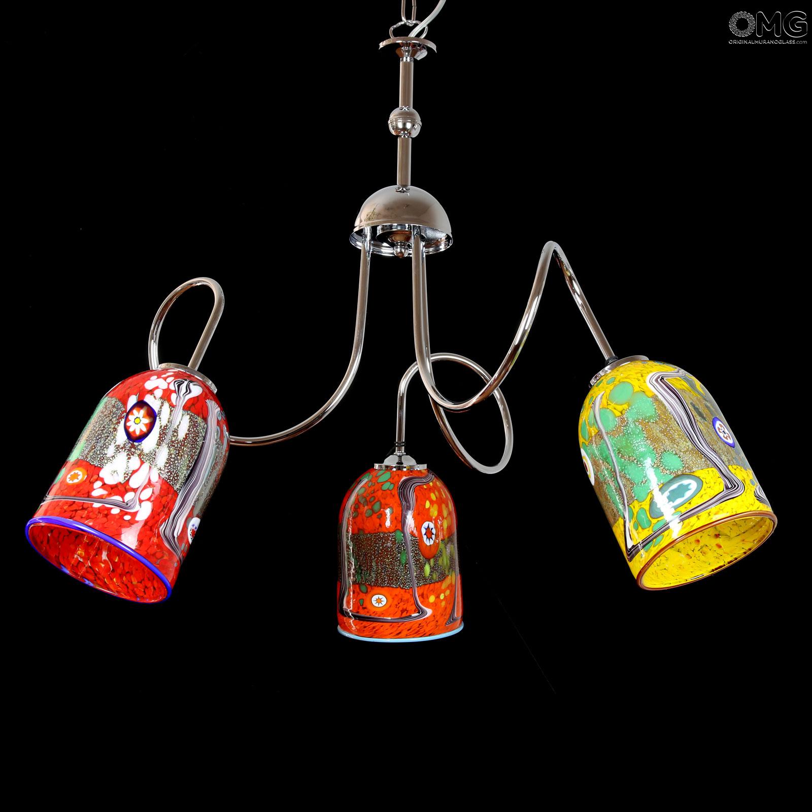 Original Murano Glass hanging lamp handmade in original venetian glass, with 3 cups holder in artistic glass with millefiori murrine and canes. The cup is very elegant and colorful. This Murano glass light will enrich your room space with unique light colors.
