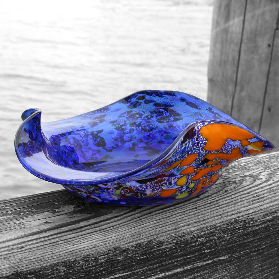 This handcrafted Murano glass bowl is made with the technique of glass blowing and murrina (millefiori) decoration, embellished with silver leaf.The organic, wavy shape adds elegance, while the silver leaf embedded in the glass enhances its brilliance and uniqueness. It's perfect as a decorative centerpiece, catching and reflecting light beautifully. The craftsmanship is outstanding truly a piece of Venetian art that showcases the skill of Murano glassmakers. Highly recommended for art lovers and collectors!