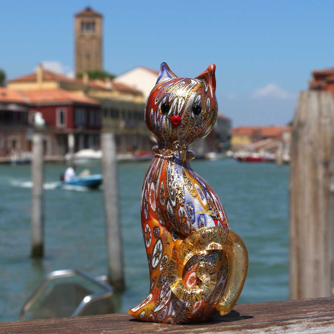 Katzenfigur aus Muranoglas mit 24-karätigem Gold und Millefiori-Murrine