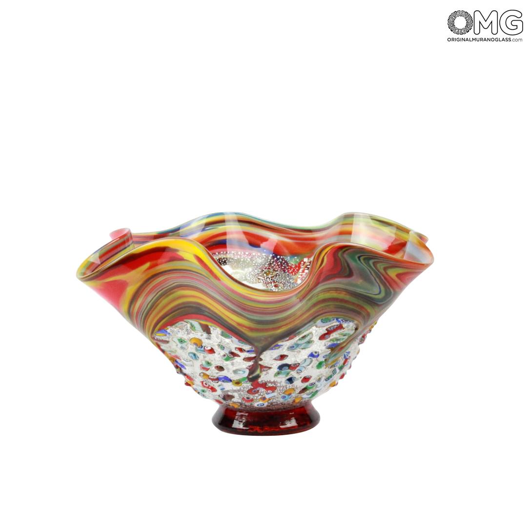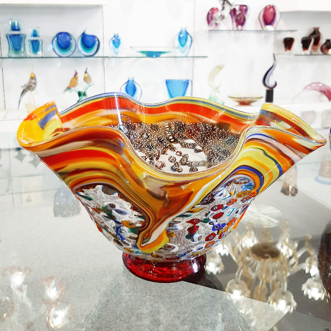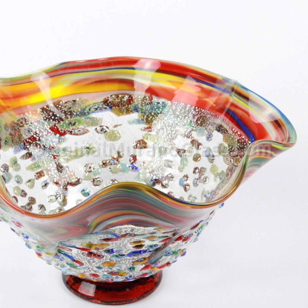 Centerpiece made with the technique of blown glass, decorated with silver leaf and colorful variegated murrine.