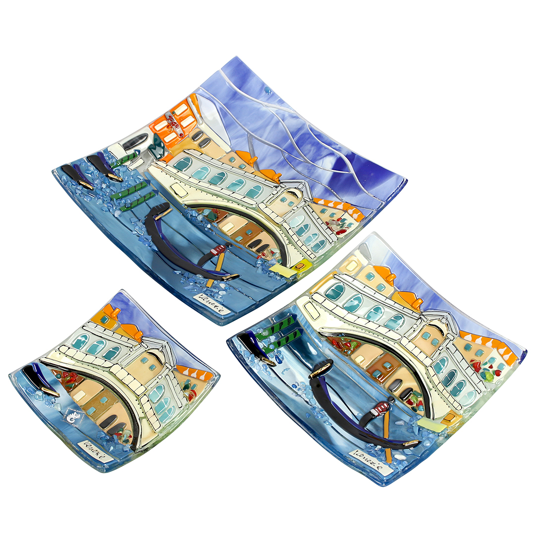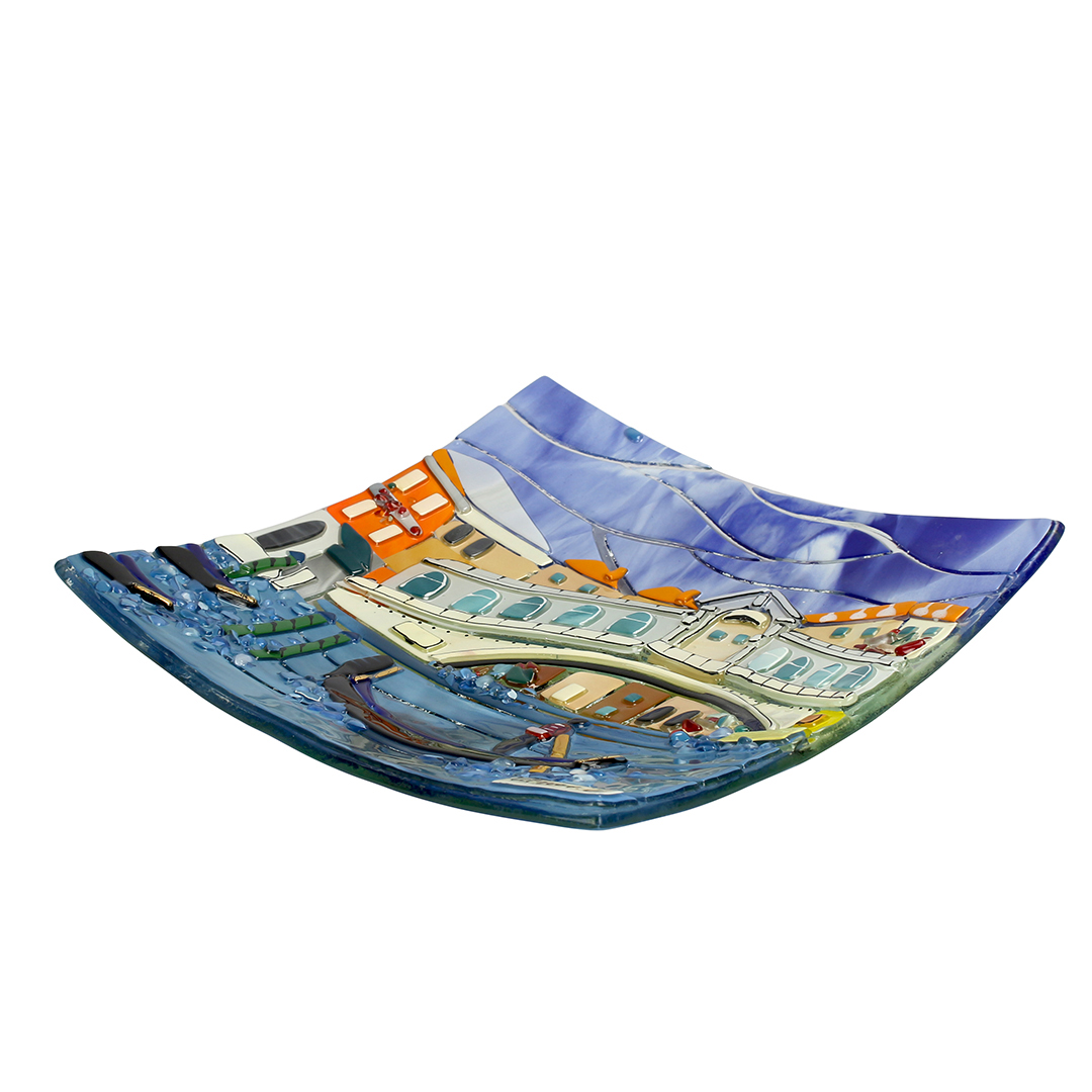 This Murano glass square plate is handmade using the technique of glass fusing. Crafted by skilled glassmakers in Murano, Italy, the plate features an artistic interpretation of the iconic Rialto Bridge, turning a functional object into a collectible piece of Venetian art.