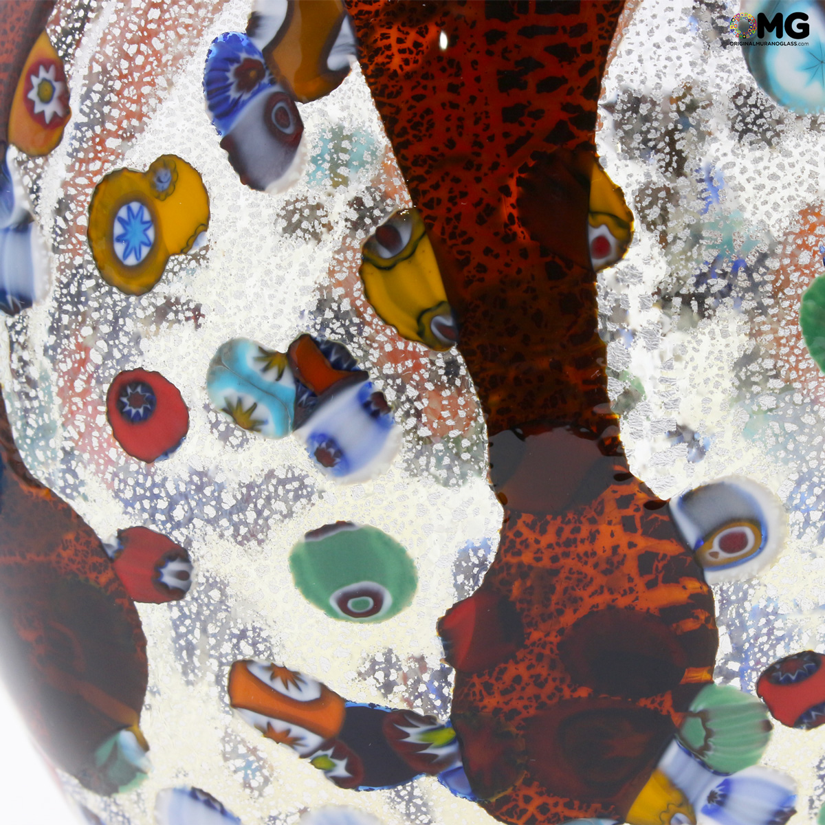 Vase handmade with the technique of glass blowing with silver and murrina milelfiori decoration. The artwork is signed by the glass master and with Original Murano Glass OMG® trademark applied.