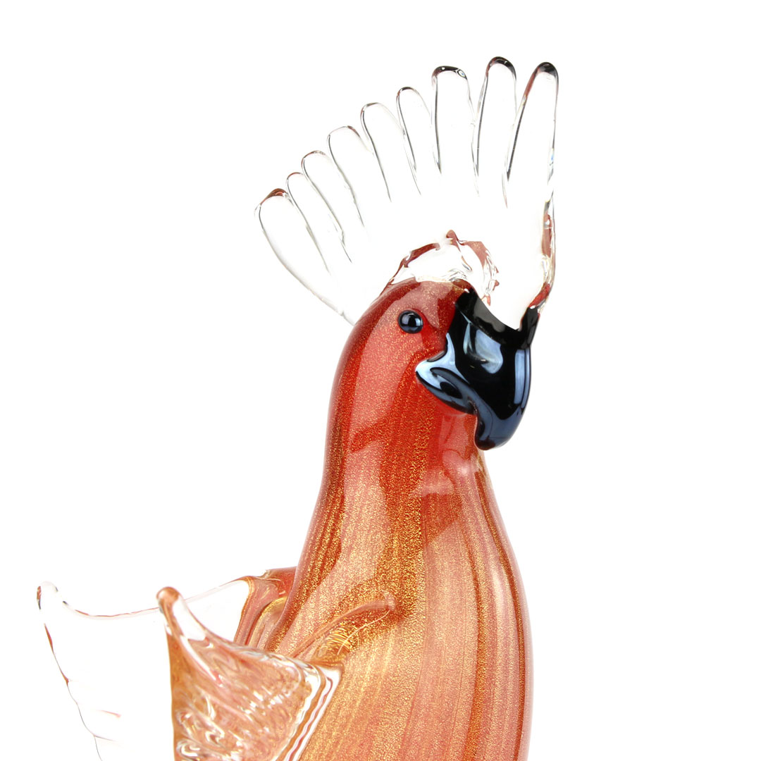 Sinuous sculpture of blackbird in red with real pure gold leaf on crystal base, worked free hand with the glass working techniques in Murano. This lovely sculpture, extremelly elegant, is the perfect artwork for a luxury shelf or to complete your rich furniture.