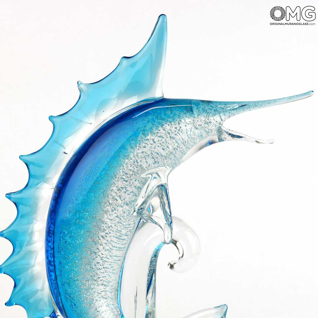 Swordfish Murano glass sculptures made with light blue glass and real silver leaf decorations, signed by the glass master.