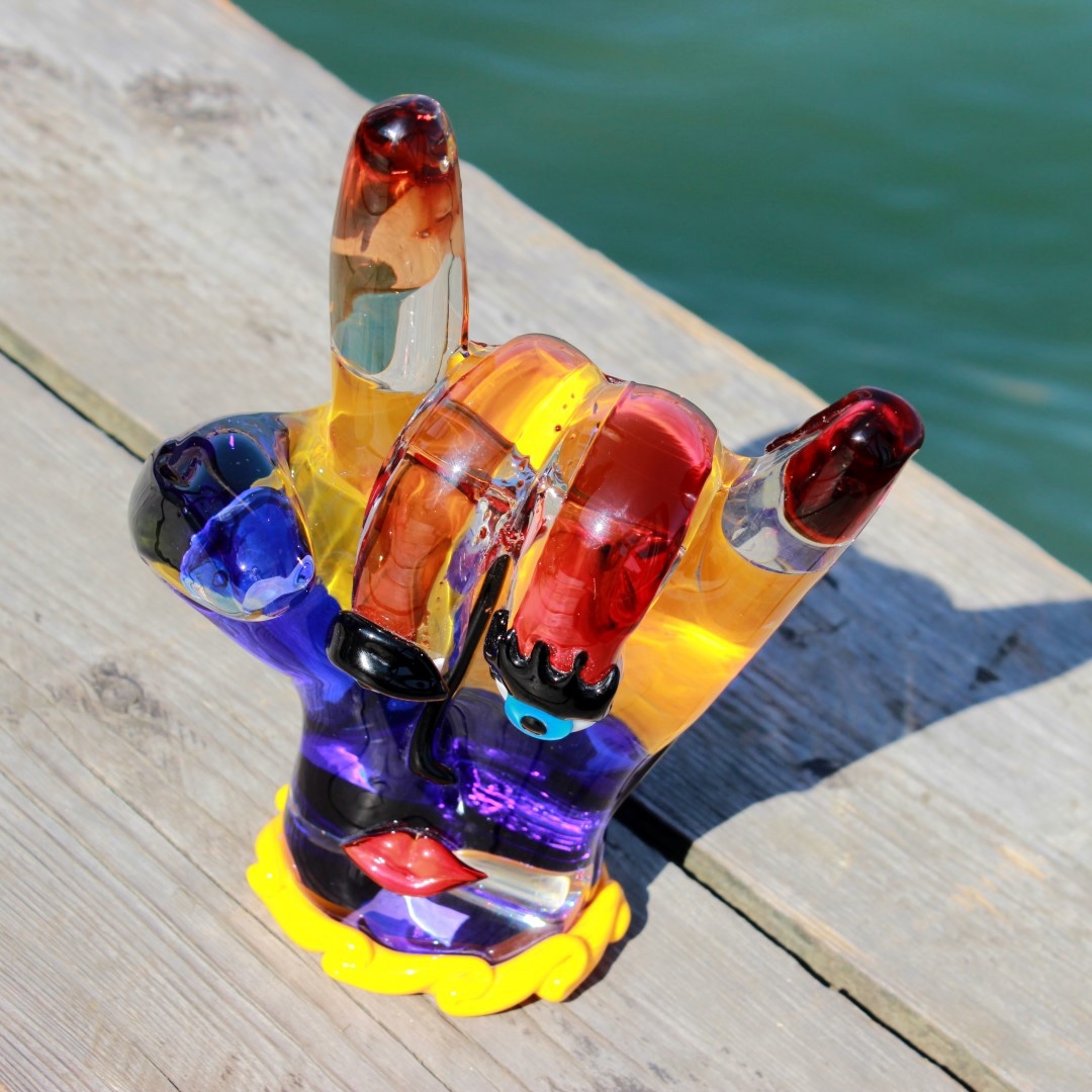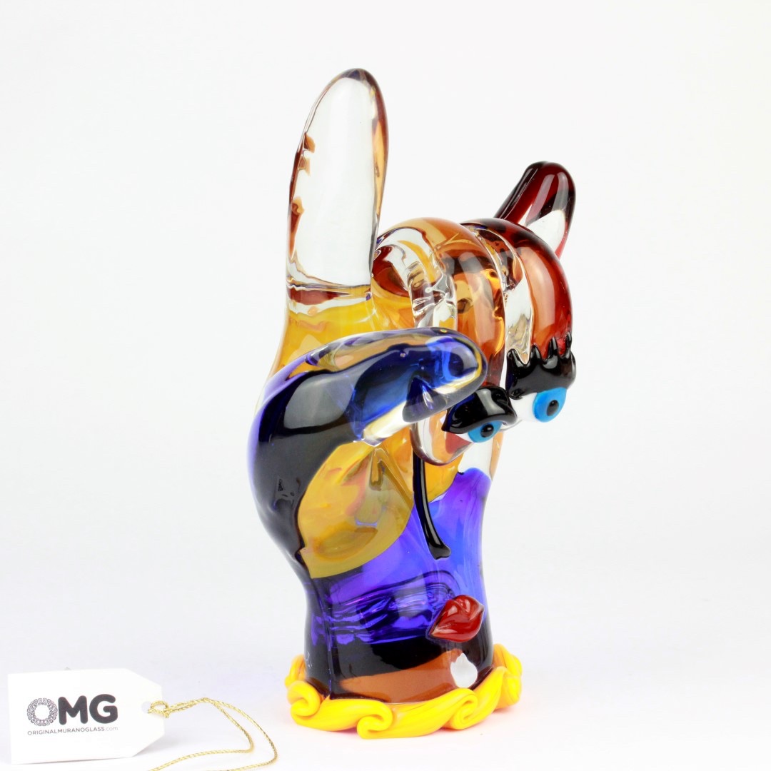 Murano Glass art gets an unexpected contemporary twist in this unique Picasso Hand sculpture. In a tribute to the most famous and revolutionary artist of the 20th century, Pablo Picasso, the inventive Murano masters created this Murano Glass sculpture, which reflects Picasso’s abstract style and avant-garde approach to art. The Picasso-inspired hand represents surrealist movement in art, with bright colors and face features. The rich deep colors of red, yellow, orange and blue, and inquisitive blue eyes convey a sunny mood and atmosphere of liberation from the canons of art and tradition. Authentic Murano Glass Picasso figures are some of the most valuable art glass pieces found only in a few select galleries in Venice. They make a unique gift for anyone who loves modern art, admires Pablo Picasso and his style, and appreciates Murano Glass and Venetian craftsmanship. The statue is authentic Murano Glass creation crafted entirely by hand using only traditional glass-making methods in a prominent Murano Glass Factory, specializing in modern art pieces. The Hand figurine features the etched signature of the master, and is accompanied by the certificate of authenticity. Because each item is a unique work of art made by hand, slight variations of colors, patterns, sizes, and shapes are possible.