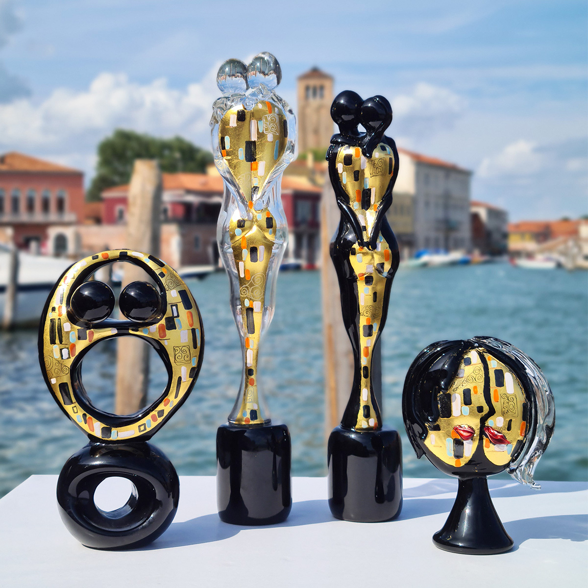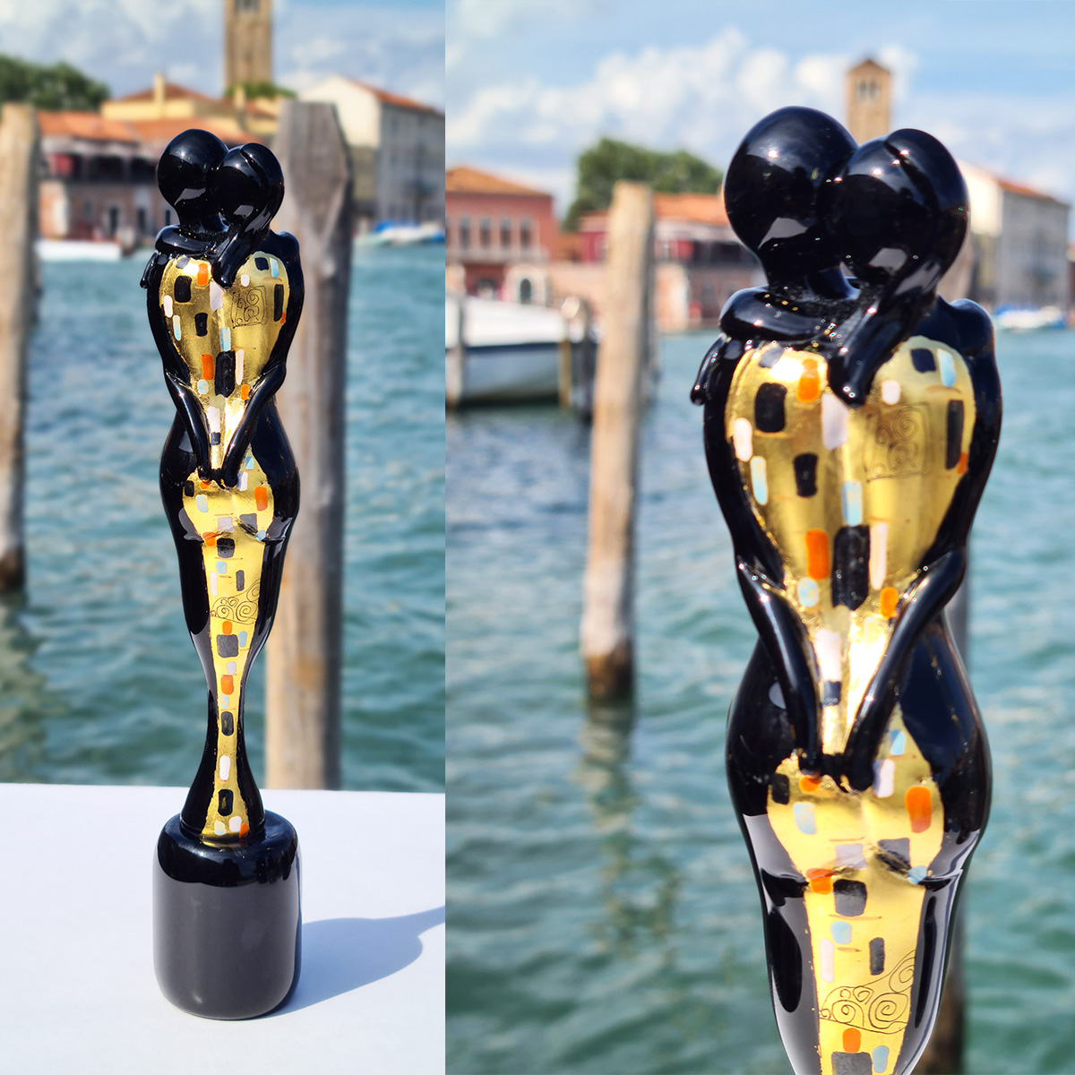 This Murano glass lovers’ bust sculpture is handmade using warm glass modelling techniques. The surface is hand-painted and engraved with gold leaf in a Klimt-inspired design, creating a luxurious and artistic finish.