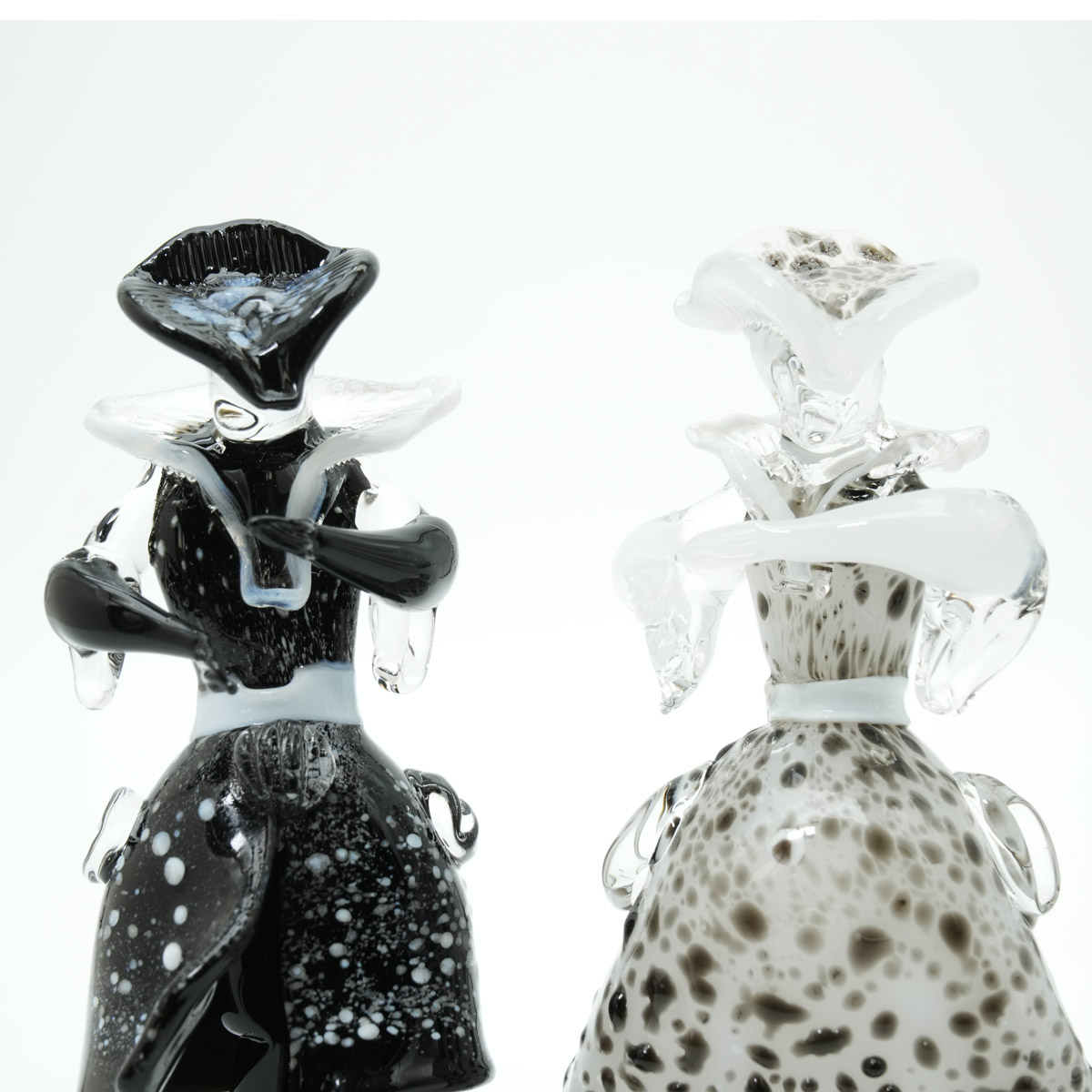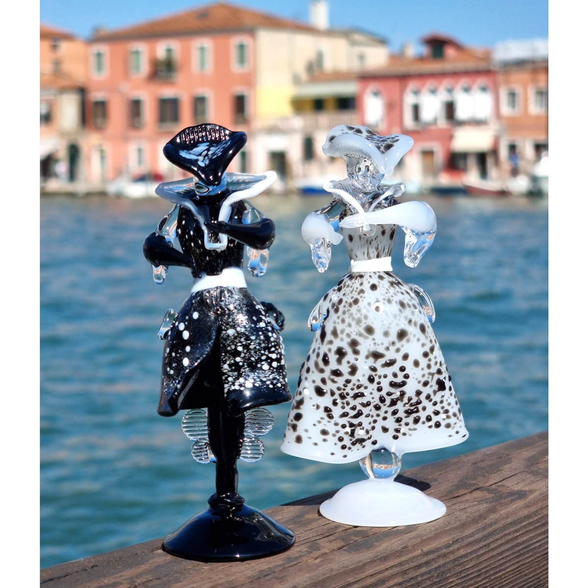 Beautiful Goldonian couple of Knight and Lady. Sculptures made with the tecnique of hand made lamp working. Very stylish couple full of harmony and color, perfectly proportioned and perfect to decorate with small pieces of glass art.