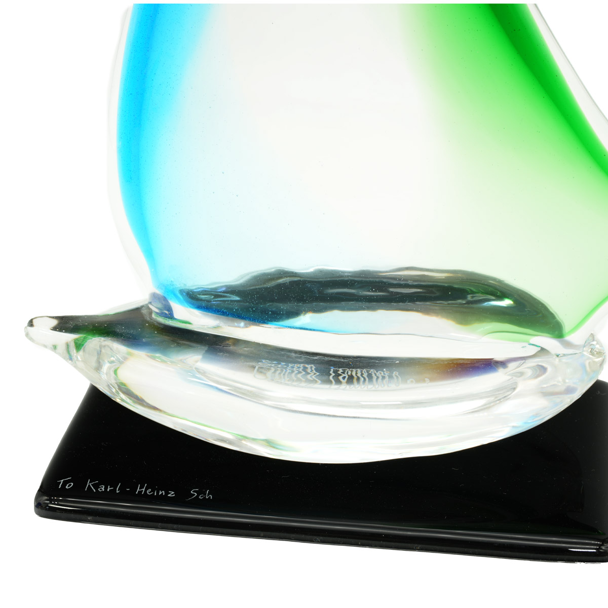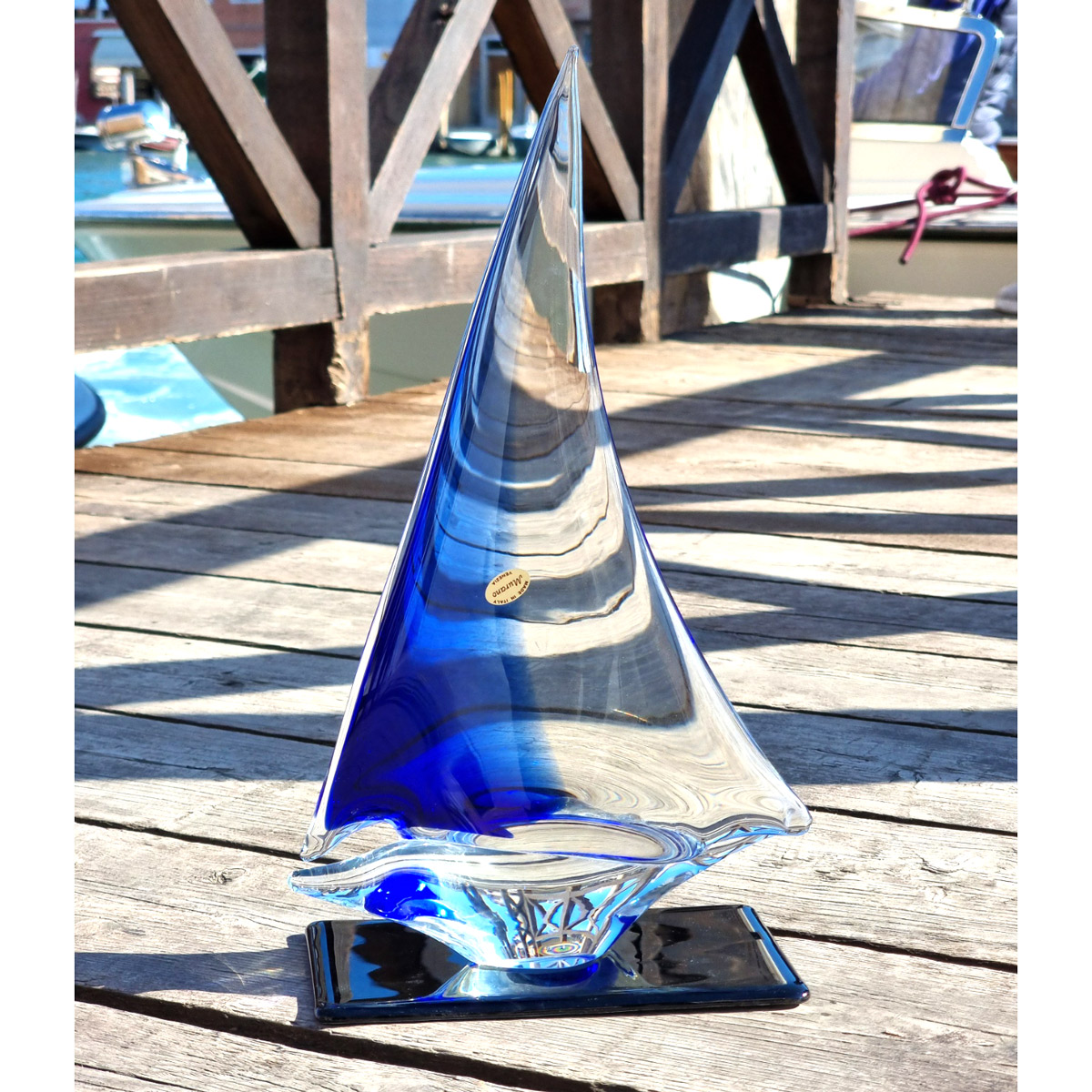 Exclusive and unique glass artwork of a handmade sailing boat in colored glass realized in free hand on a punty in solid glass.