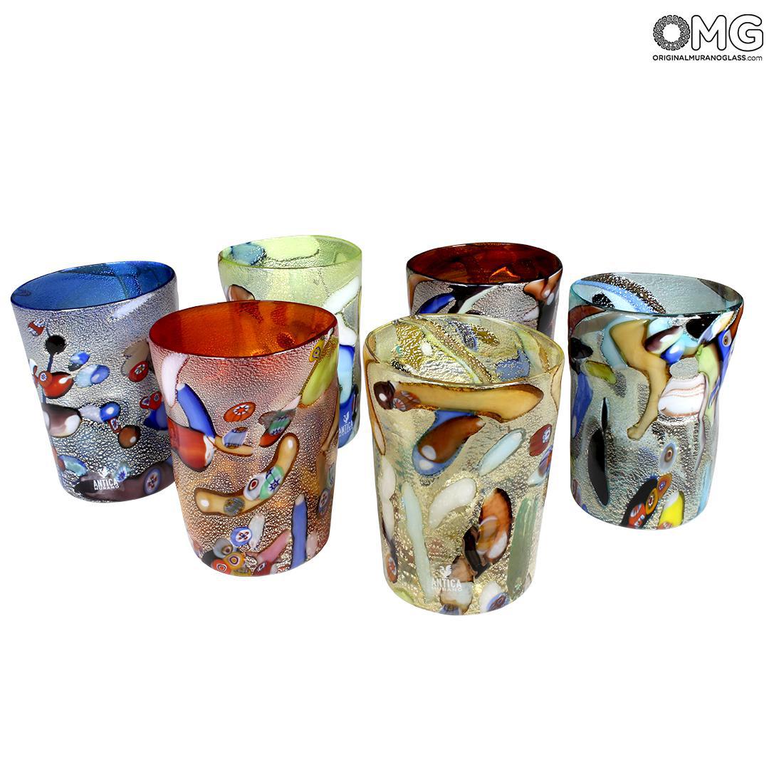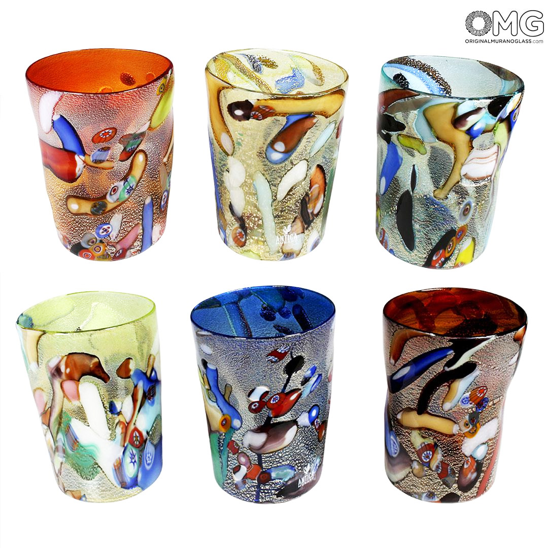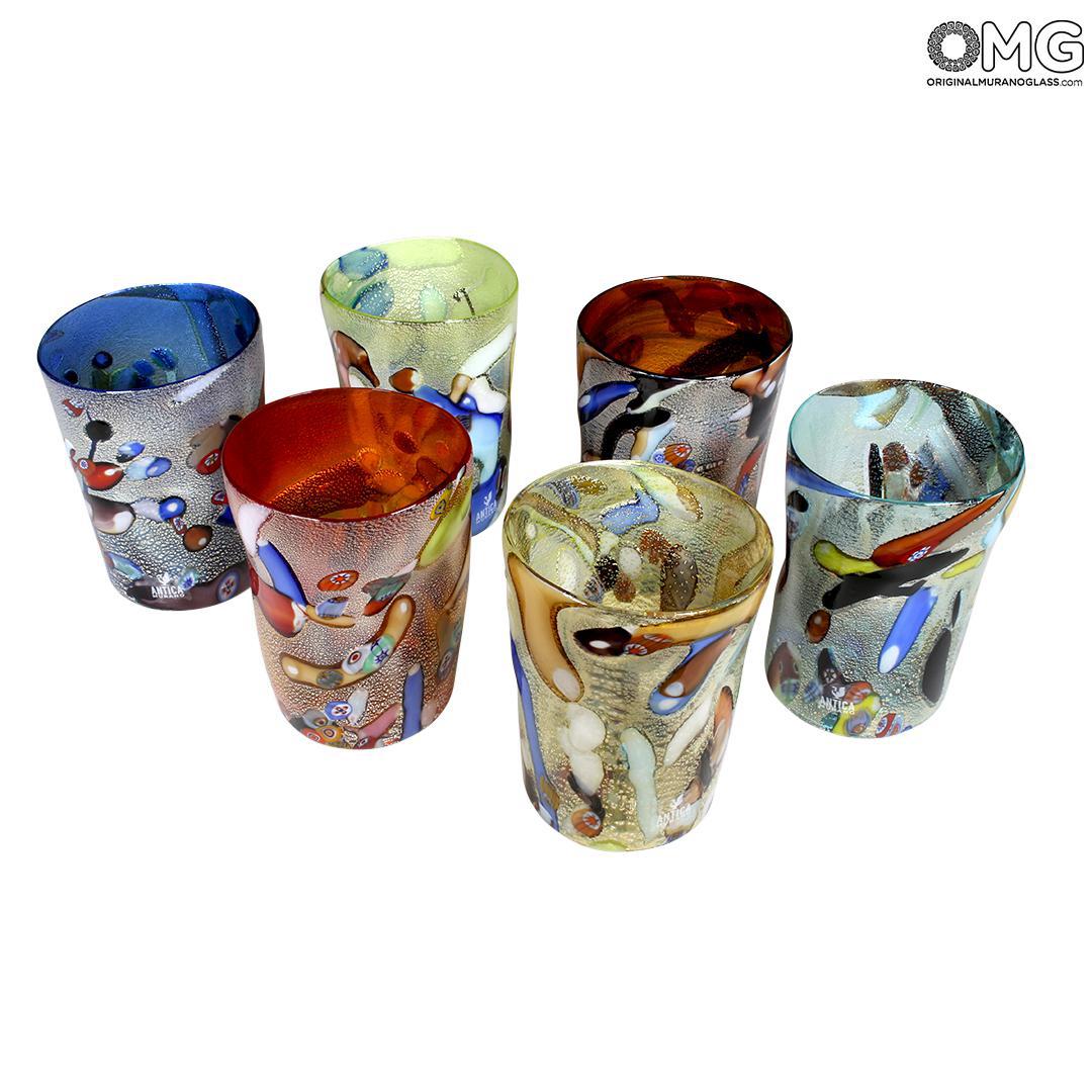 Set of 6 glasses in completely blown and handmade by famous Murano glass-masters, with pure silver.