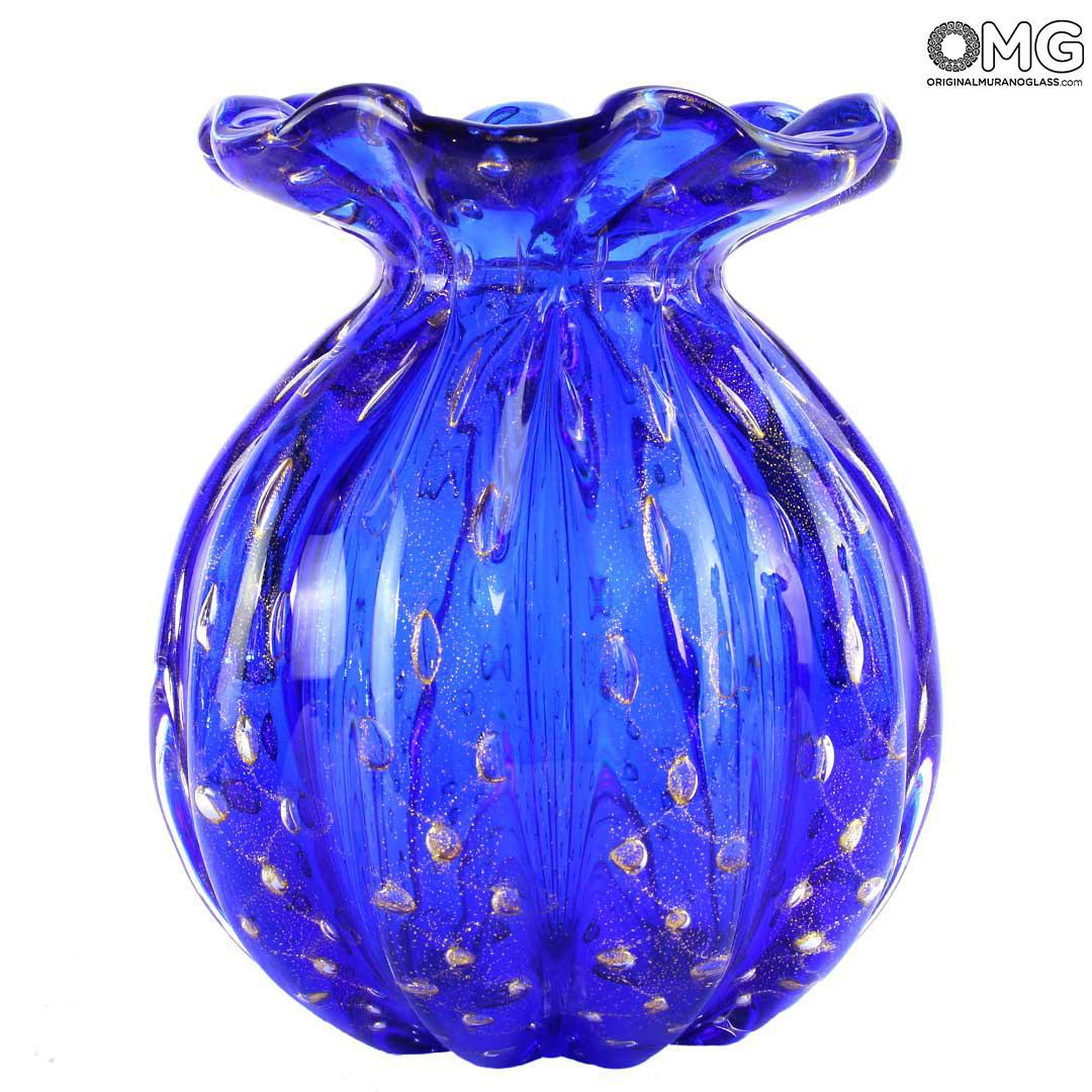 Luxury hand made vase inspired by the 60s. Featuring bubbles details on blue glass and pure gold 24kt. Imagine this eye-catching artwork as a precious centerpiece for your living room