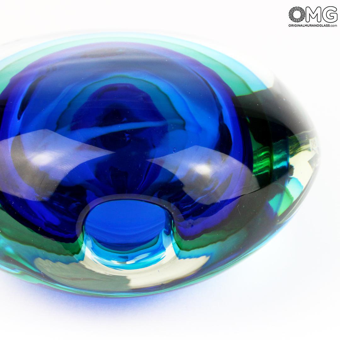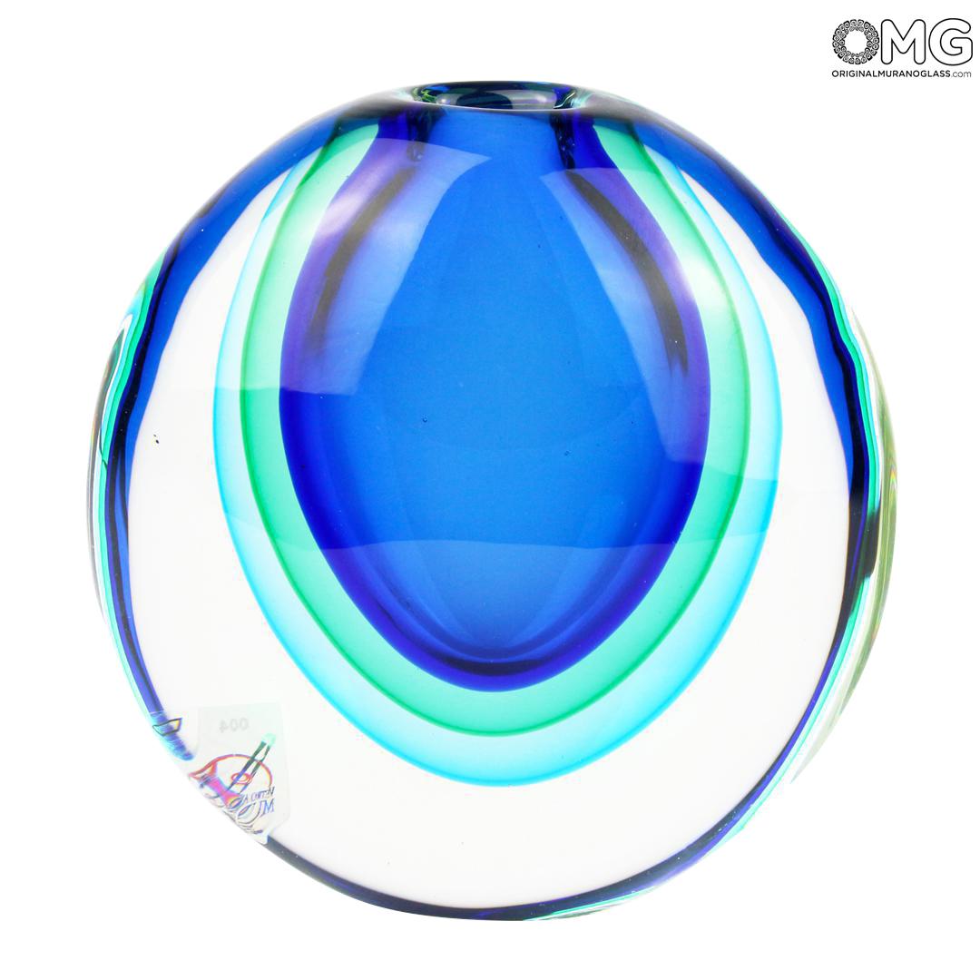 Handmade vase of noble facture. A primary mass of blue became covered by a new mass of light green, than covered again with light blue. A mass of crystal is used to cover the colored one an finally the work is modeled. All became covered with a new mass of cristal. The vase once blown receive its last working and the artpiece is so done. A colorfull vase but at the same time elegant and sober. Well to furnish a vaste kind of furniture or to host flowers.