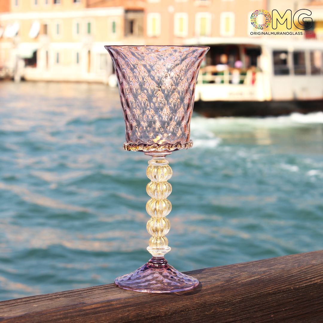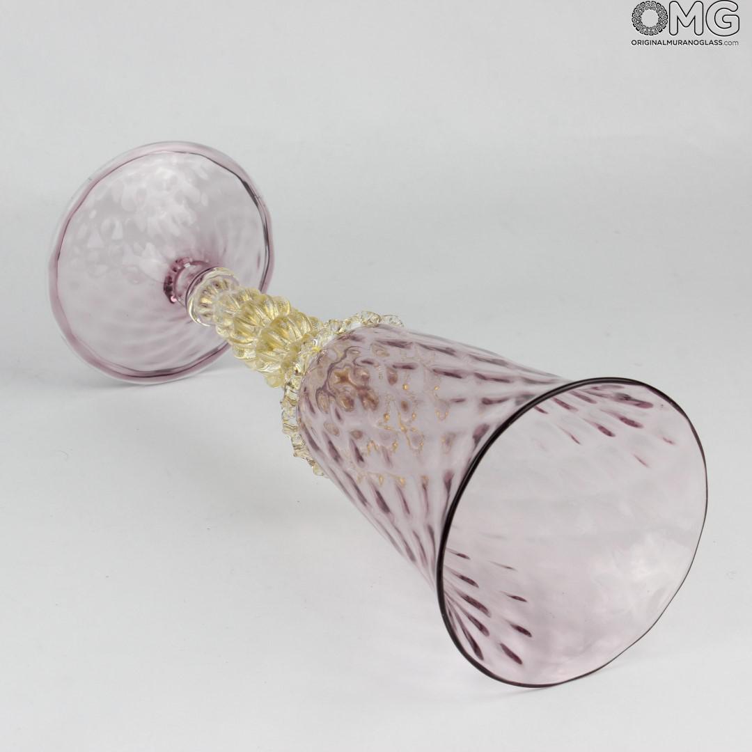 Blown glass goblet decorated with violet amethyst glass. Gold 24 carates leaf decoration in the stem. Perfect details. In the middle has a beautiful decoration made with the tecnique of glass modellation.