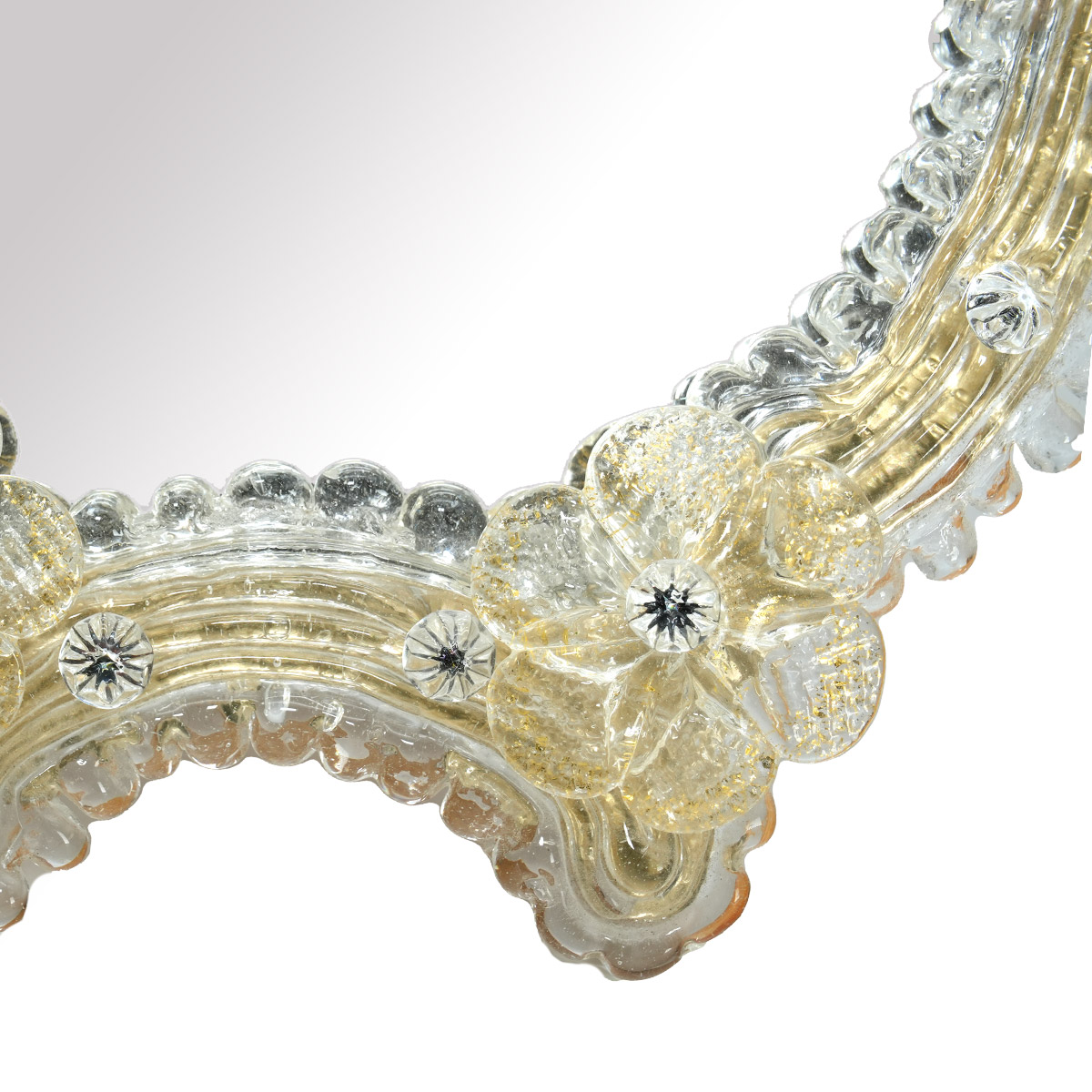 The frame mirror consists of flower and leaves decoration made in authentique Murano glass.