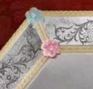 The mirror consists of 20 flowers and canes curls, with glass fused with 24kt gold, and wooden frame.