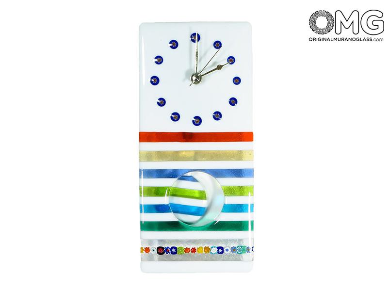 Farbenfrohe Pendeluhr, hergestellt in Glasfusing-Technik mit Millefiori-Elementen. Ein wunderschönes Kunstwerk, das Ihrem Zuhause oder Büro einen Hauch von Fröhlichkeit verleiht. Auch eine schöne Geschenkidee für ein nützliches und witziges Präsent.